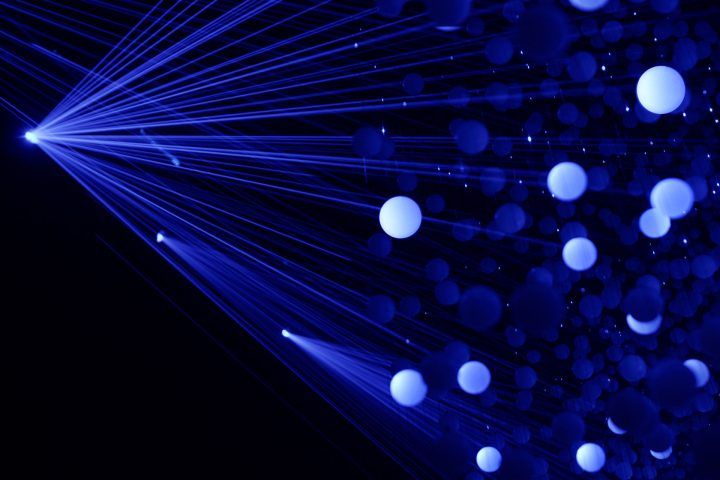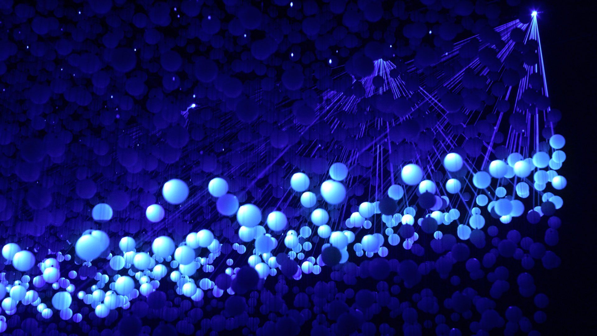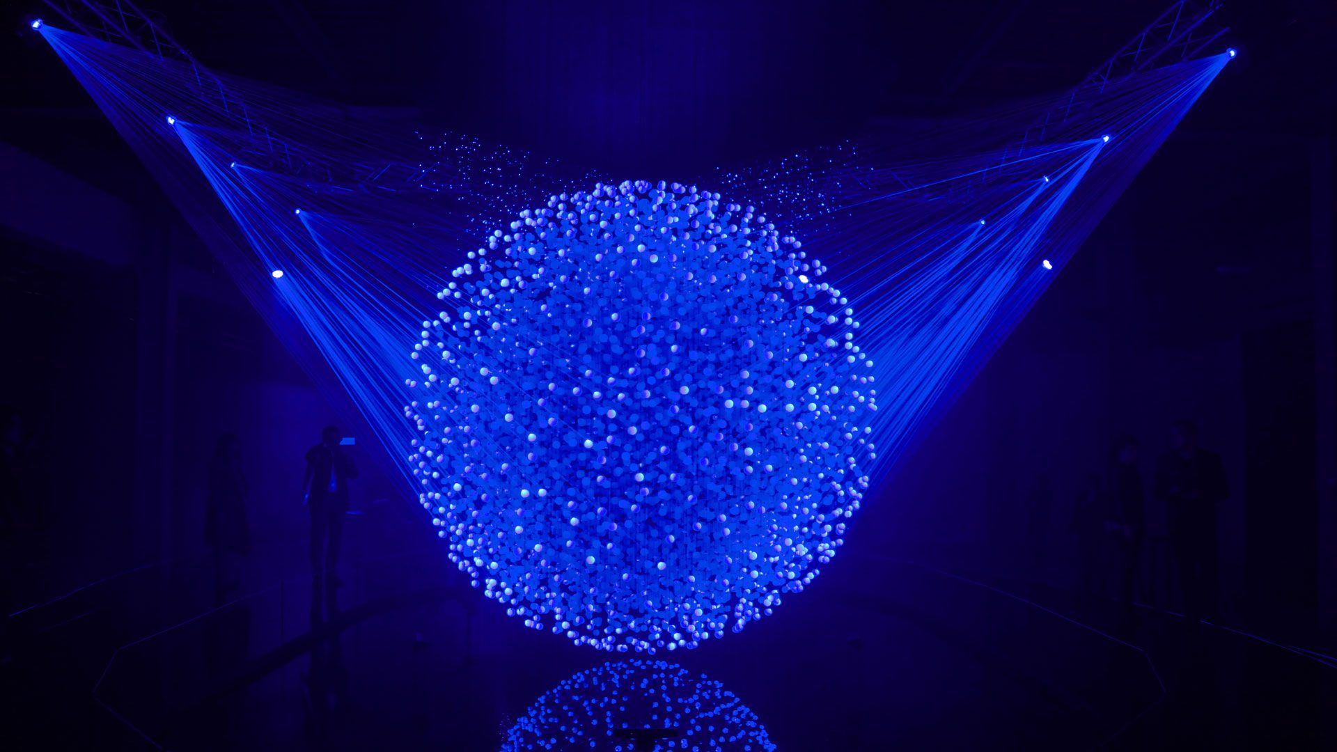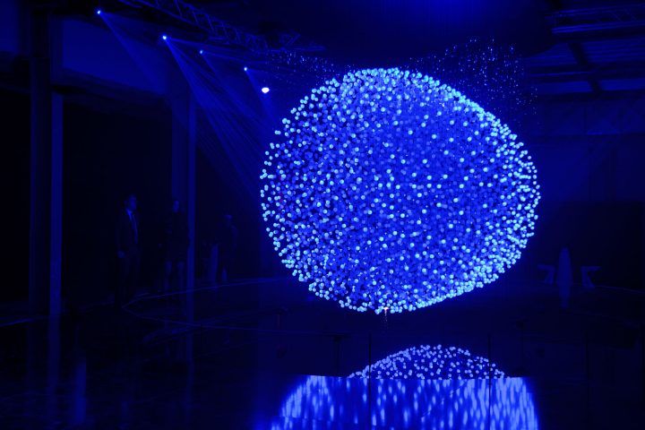 A seemingly floating point cloud above a water pond and consisting of 12,000 translucent spheres marks the heart of the installation. Due to a complex computer algorithm the spheres are arranged seemingly random within the cloud. At the same time the algorithm observes the positions and projection angles of eight high-speed laser projectors that are being arranged around the artwork.