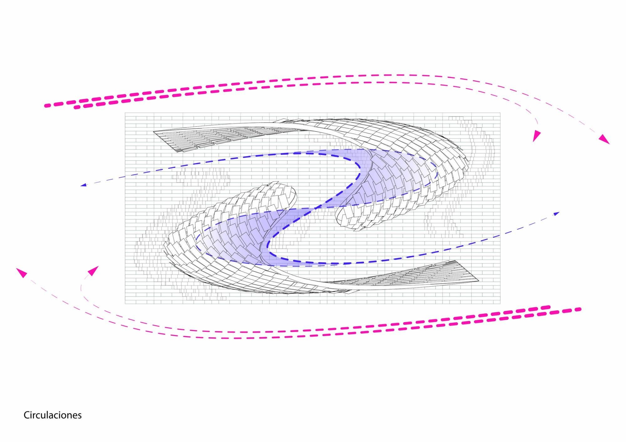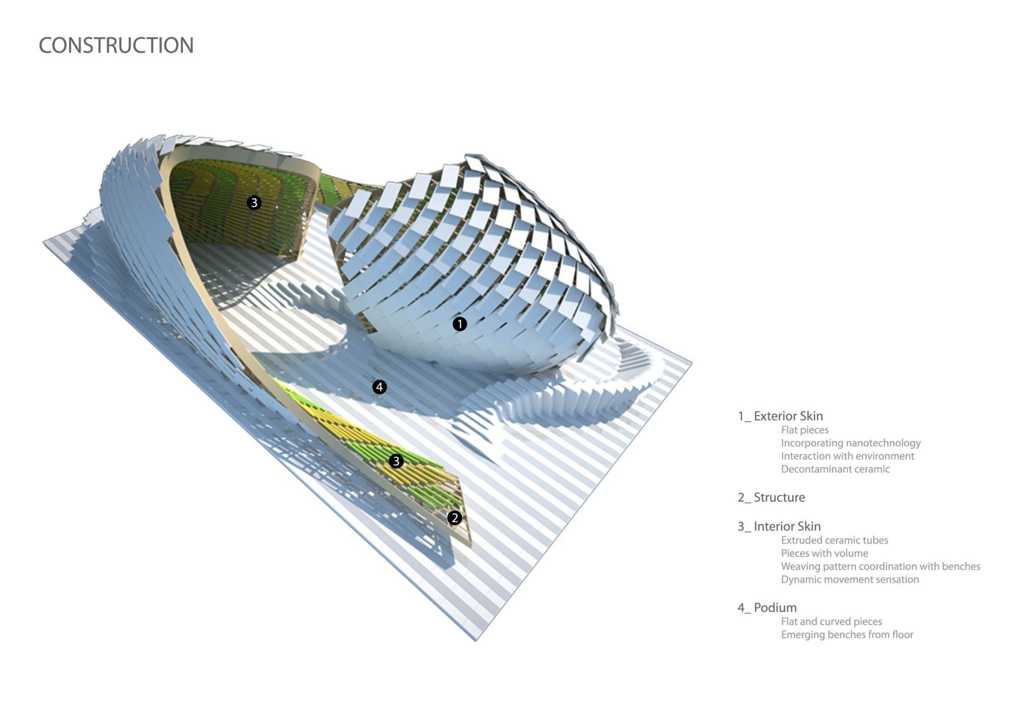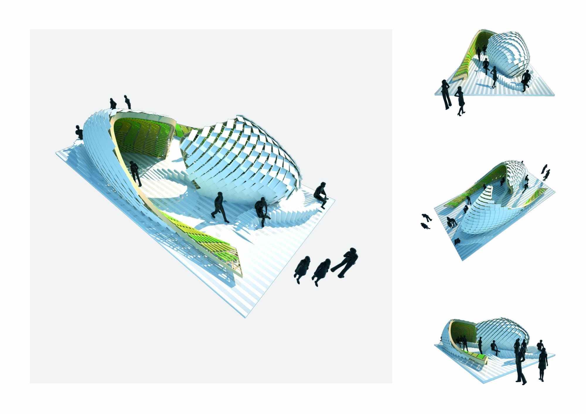 Fluidity is an urban element with a double skin: the outer surface is made of elements which decontaminate the air, and is connected with an inner surface generated out of extruded ceramic tubes. On the inside the floor bends to form waves which generate a dynamic space synergically connected with the outer skin.