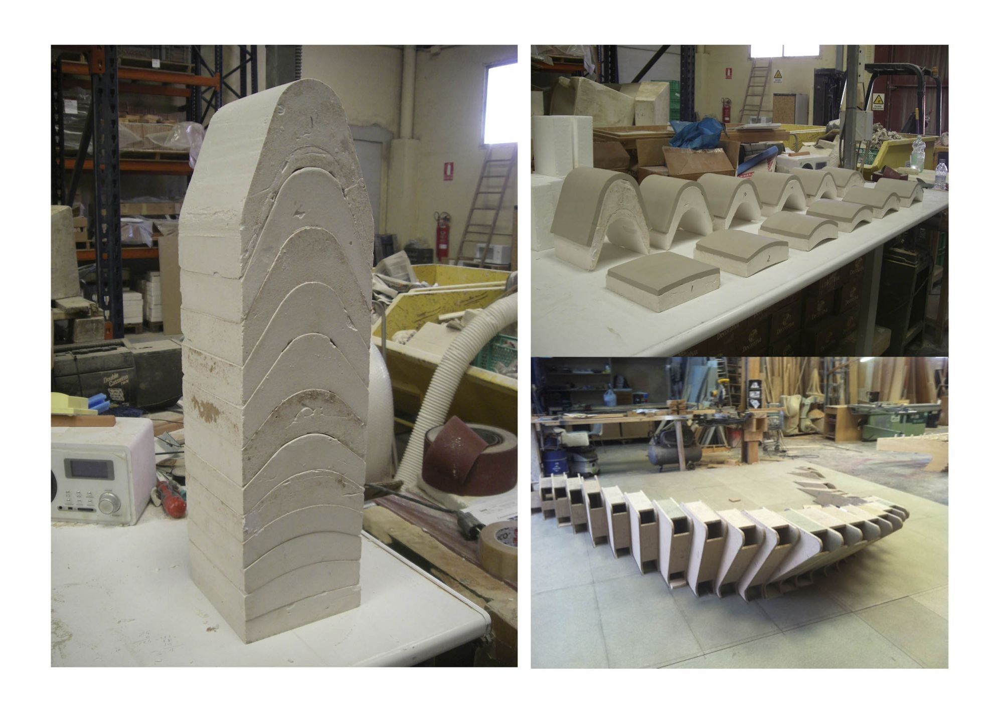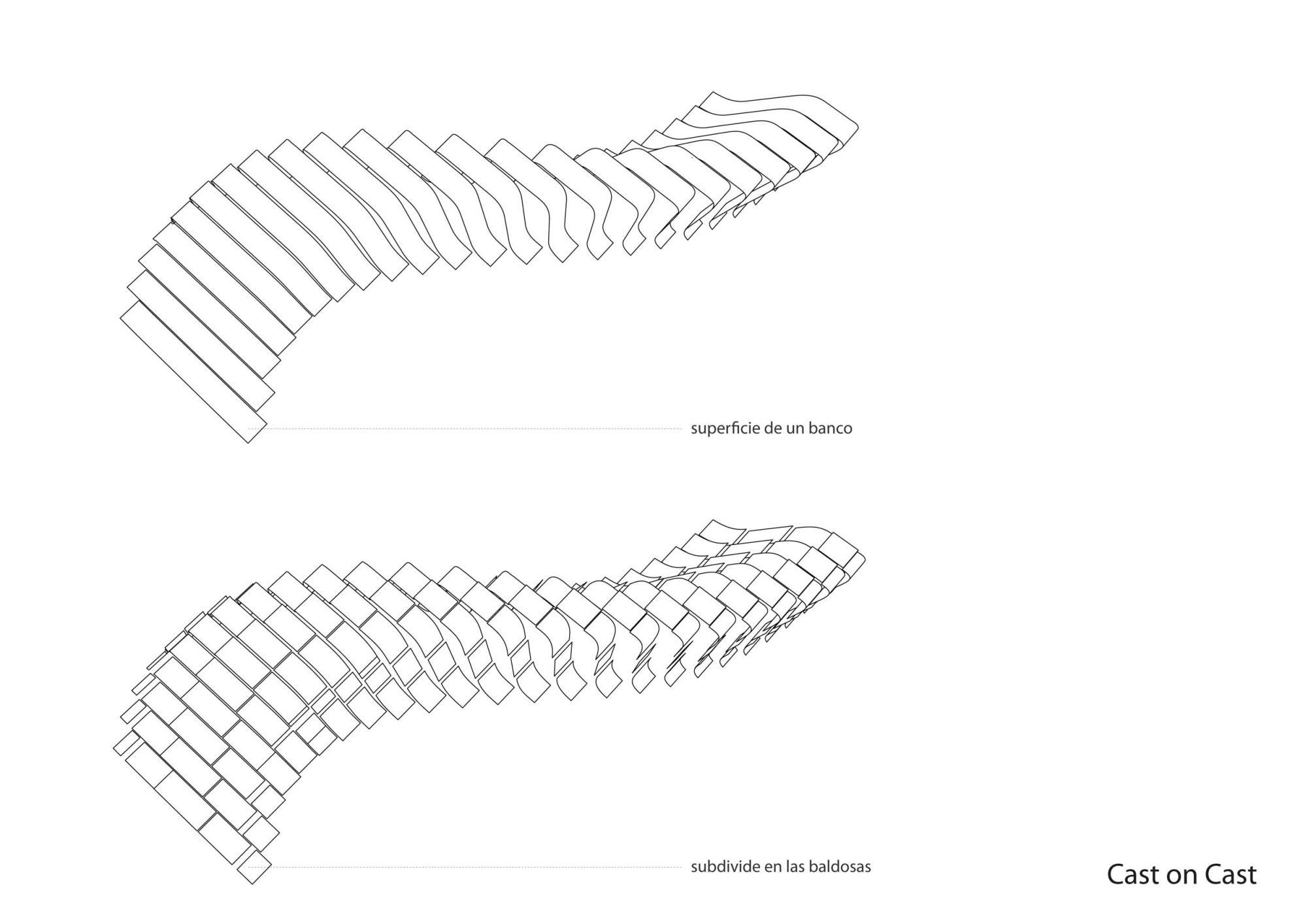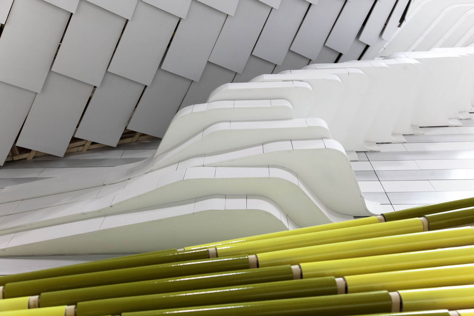 Fluidity is an urban element with a double skin: the outer surface is made of elements which decontaminate the air, and is connected with an inner surface generated out of extruded ceramic tubes. On the inside the floor bends to form waves which generate a dynamic space synergically connected with the outer skin.