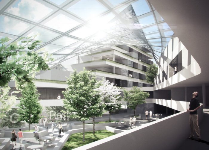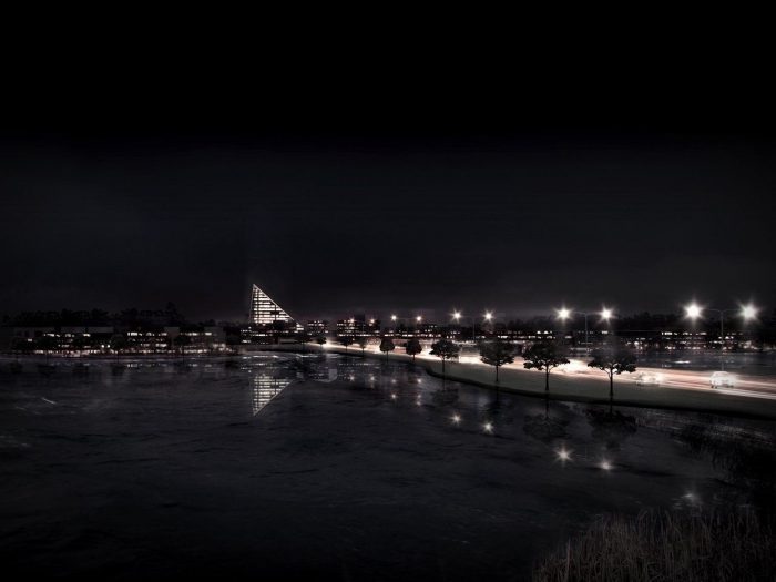 This idea was achieved by designing the lower floors with open plans to allow for multi-purpose spaces, while also integrating apartments, a hotel, retail, and a cultural podium. With this proposal, the location and conditions played a part in the decision making as the tensile steel and glass structure extends the buildings usage in the harsh and cold finnish environment, minimizing the exterior envelope surface and directing sun light.”]