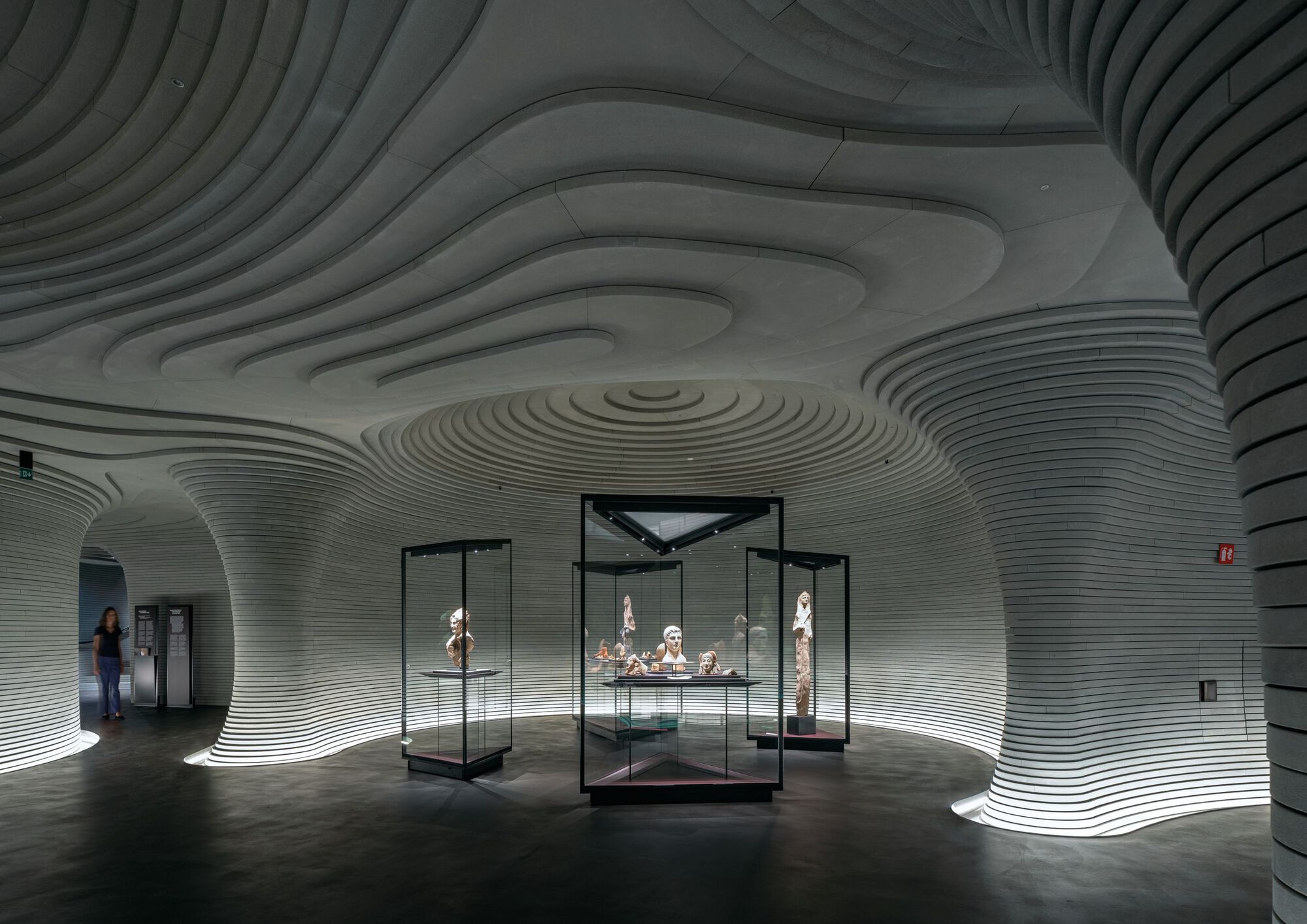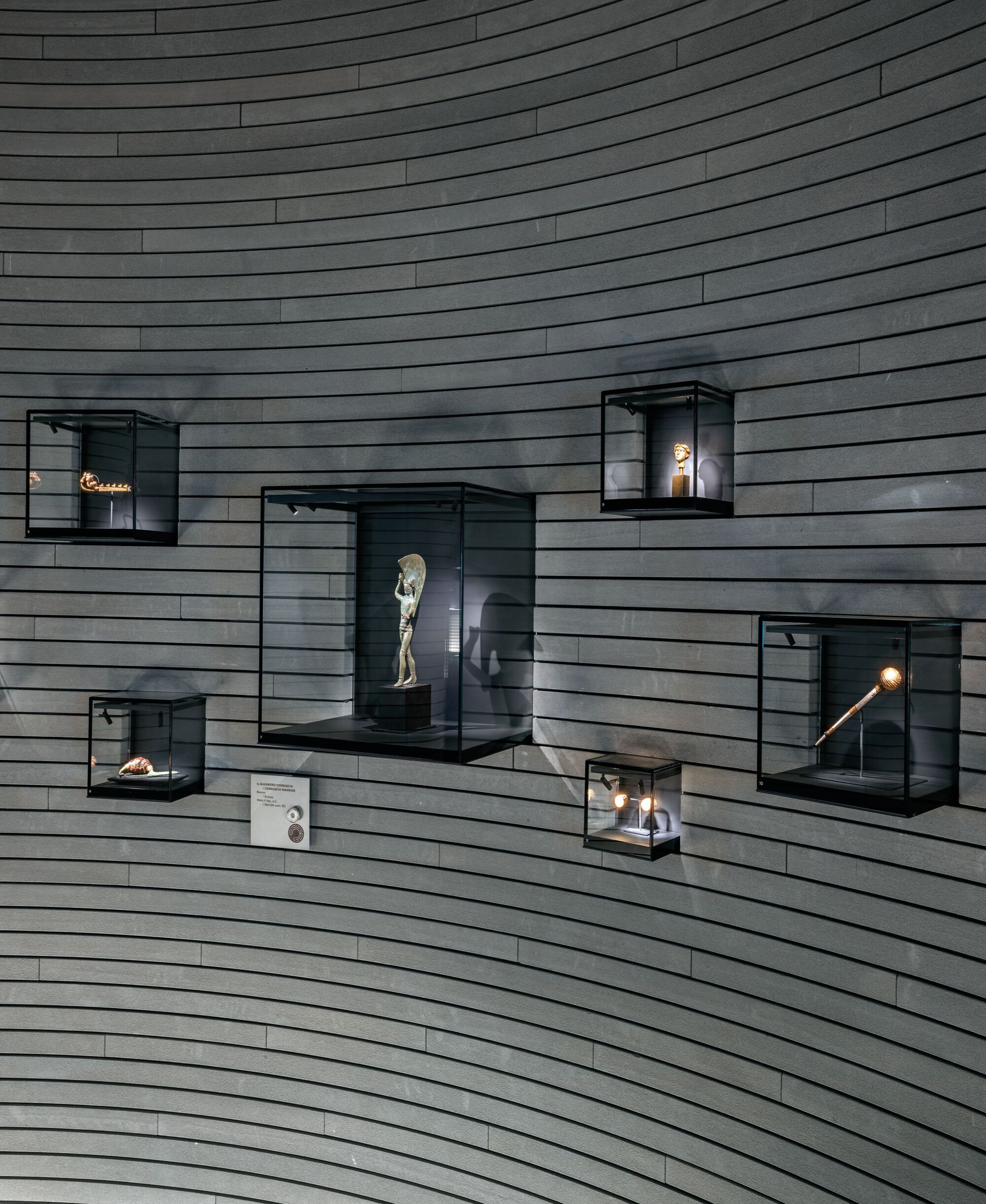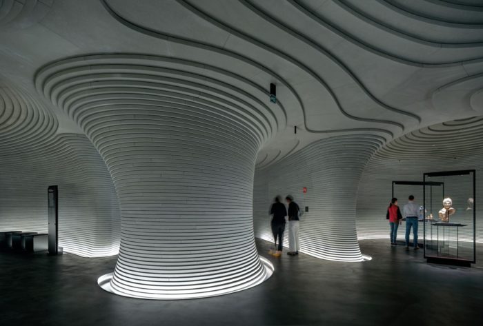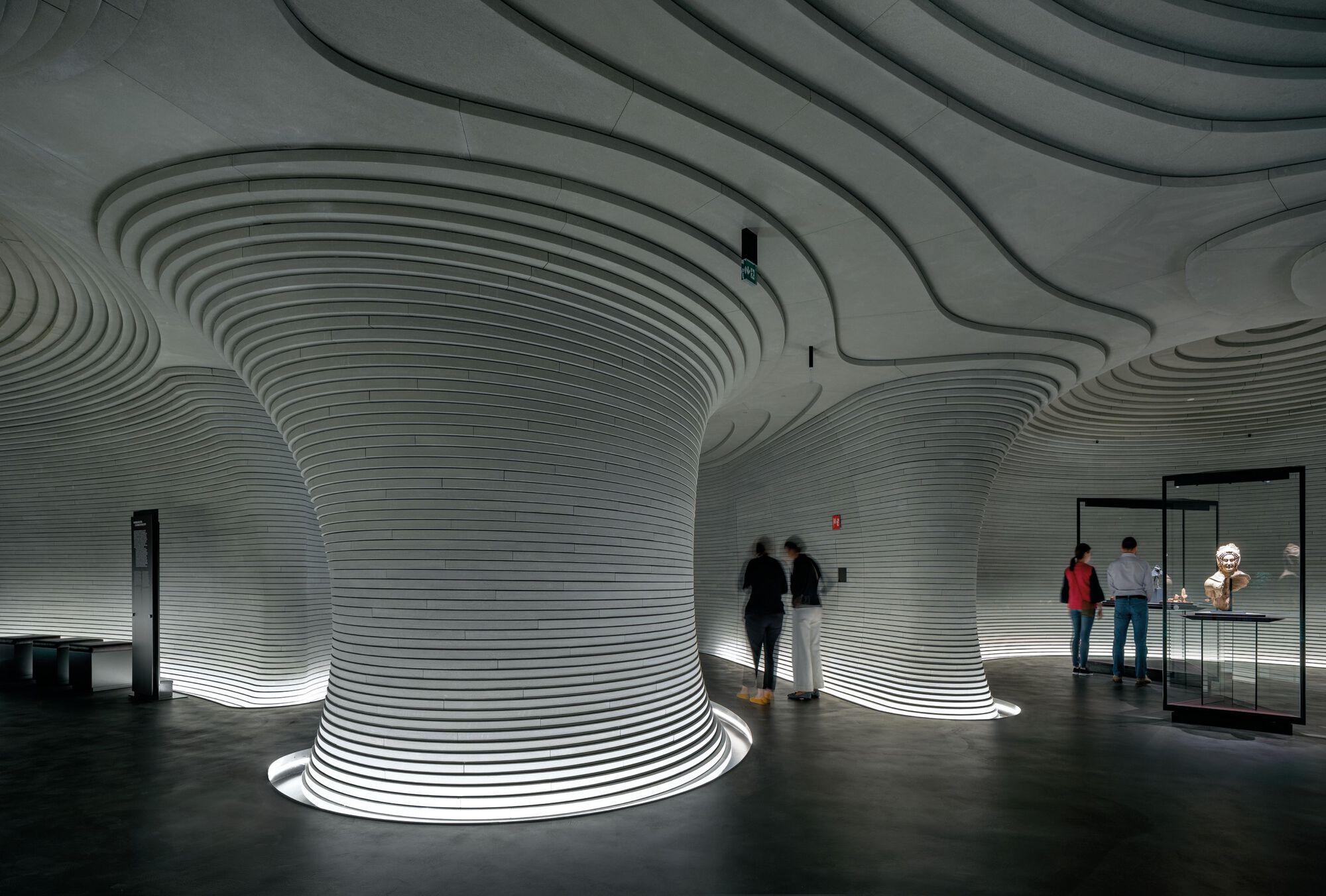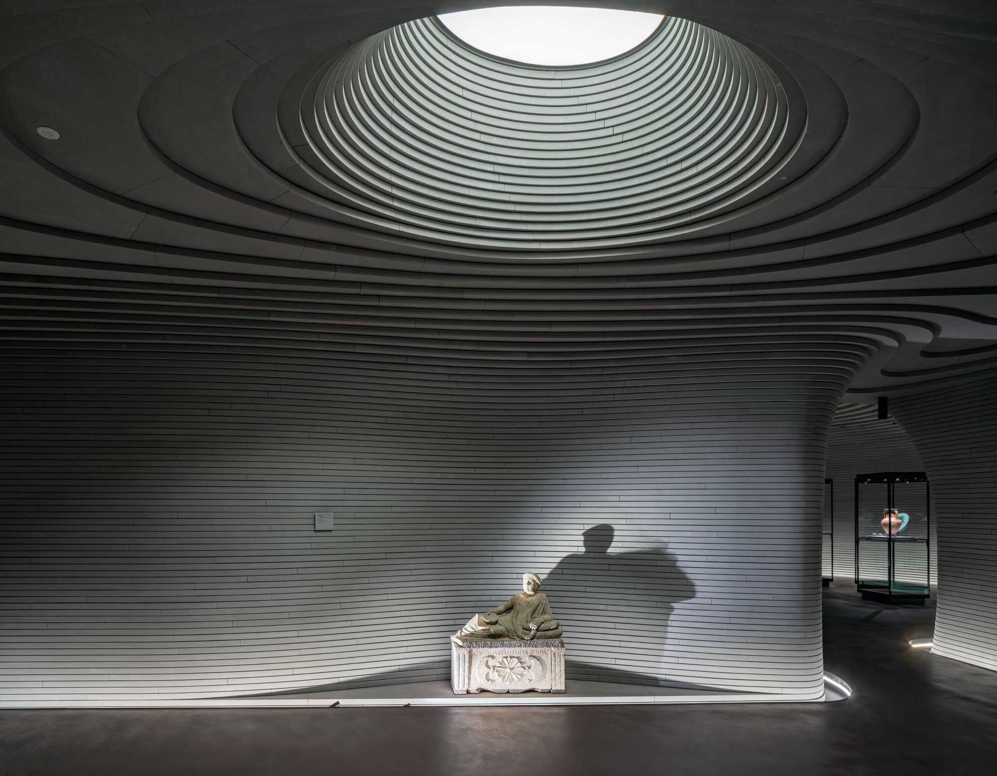 The Hypogeum Floor in Fondazione Luigi Rovati is an architectural marvel, consisting of three circular and one elliptical domed “caverns.” Its design is intricately inspired by the Etruscan tombs of Cerveteri in modern-day Lazio, and it takes cues from the unique geological attributes of the quarries in Firenzuola, Tuscany. These quarries yield the distinctive blue-grey pietra forte fiorentina limestone, adorned with glistening mica flakes arranged in overlapping strata. This captivating limestone defines the architectural essence of the Etruscan tombs and the contemporary 21st-century galleries, imbuing them with a profound sense of history and material significance.