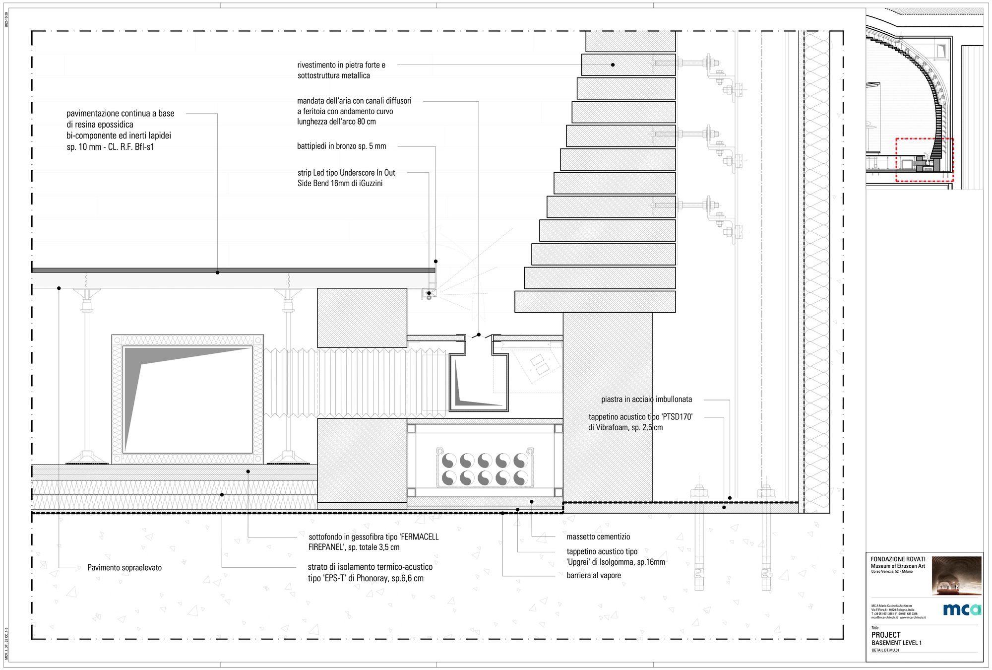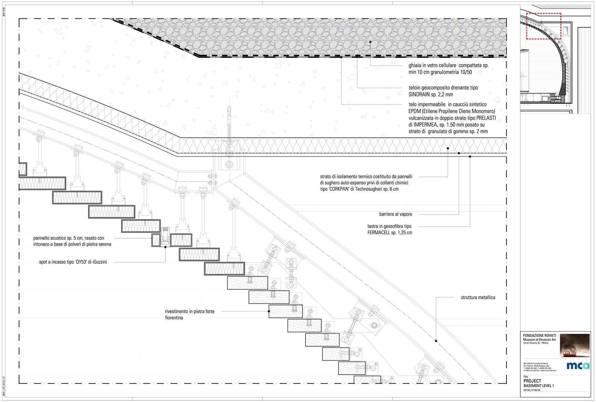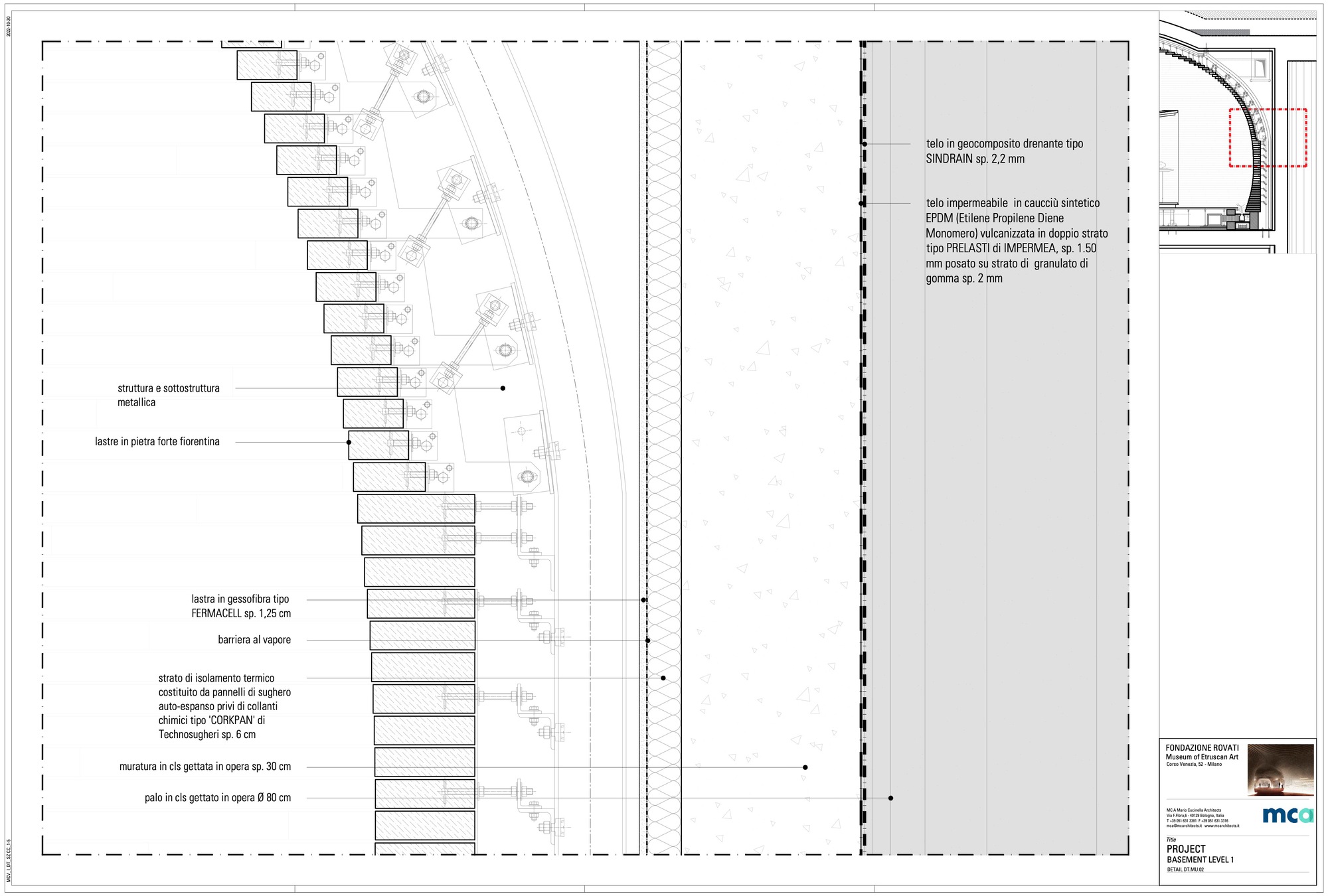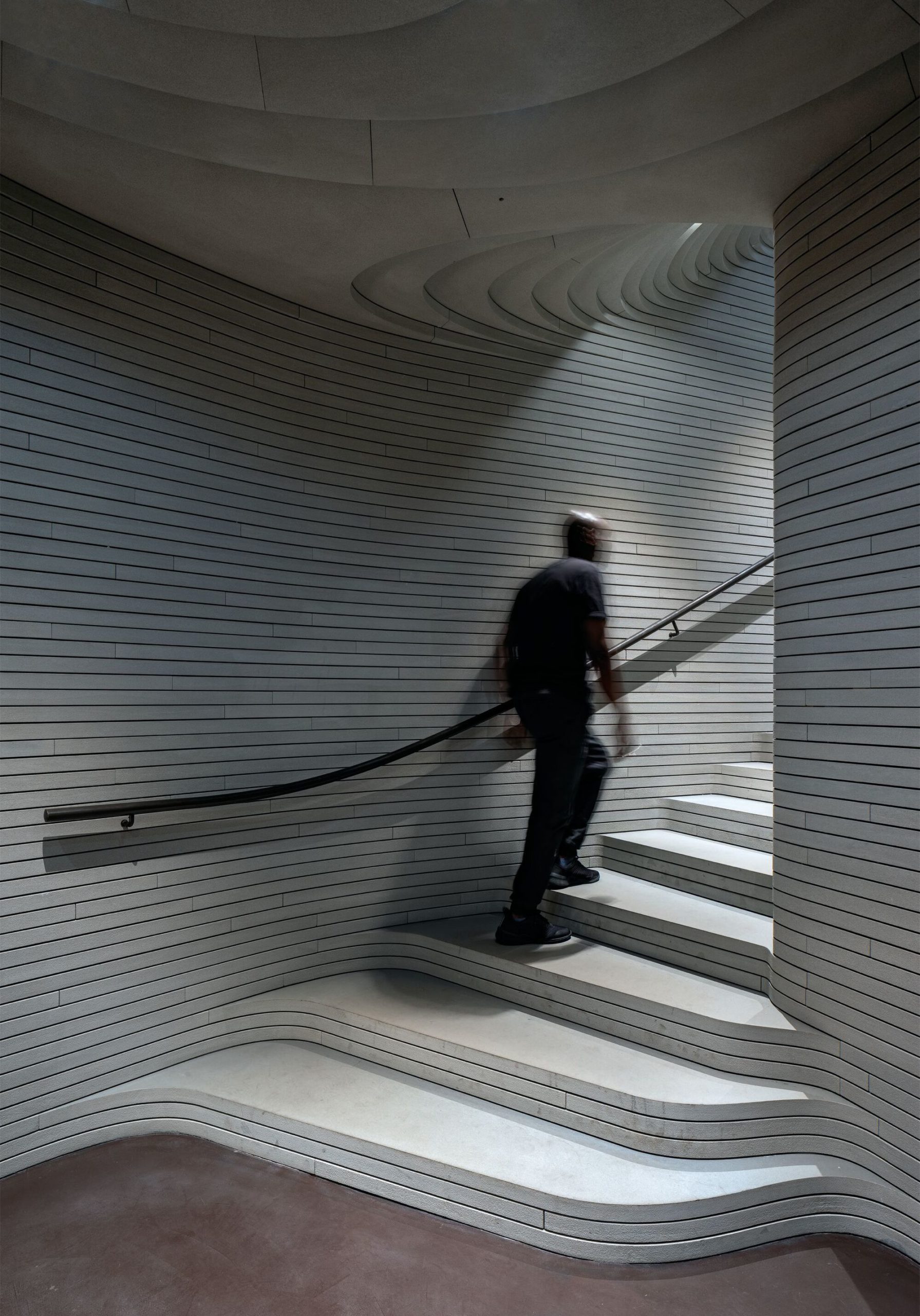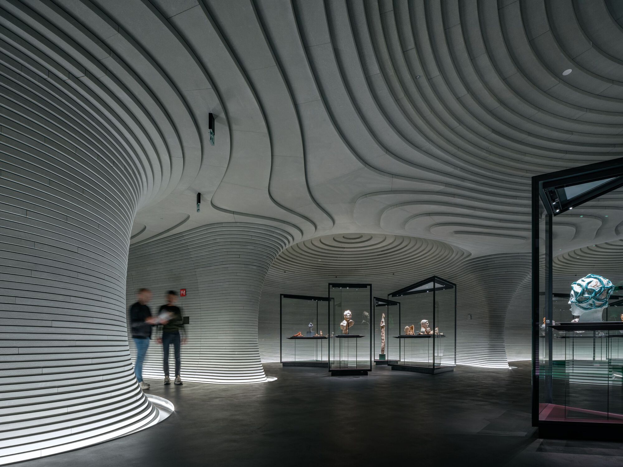 The Hypogeum Floor in Fondazione Luigi Rovati is an architectural marvel, consisting of three circular and one elliptical domed “caverns.” Its design is intricately inspired by the Etruscan tombs of Cerveteri in modern-day Lazio, and it takes cues from the unique geological attributes of the quarries in Firenzuola, Tuscany. These quarries yield the distinctive blue-grey pietra forte fiorentina limestone, adorned with glistening mica flakes arranged in overlapping strata. This captivating limestone defines the architectural essence of the Etruscan tombs and the contemporary 21st-century galleries, imbuing them with a profound sense of history and material significance.