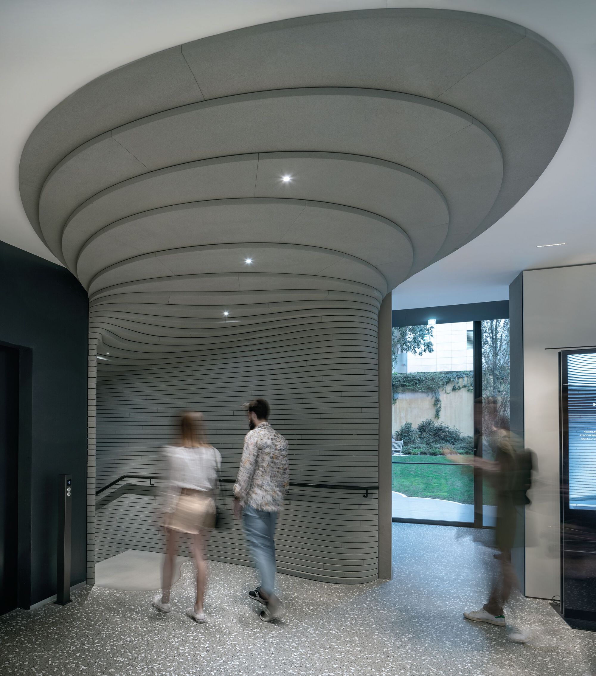 A cryptic stone staircase serves as the portal to the Hypogeum Floor, accessible from the Foundation’s entrance hall at street level. This entry area encompasses a ticket office, a cafe restaurant, and a bookshop, offering access to a courtyard garden thoughtfully designed by Greencure Marilena Baggio Studio of Milan. In this tranquil garden, the silhouettes of the Fondazione Luigi Rovati’s distinctive domed structures become discernible. Above, a mezzanine level hosts the Luigi Rovati Foundation’s offices, completing this architectural gem’s multifaceted offerings.