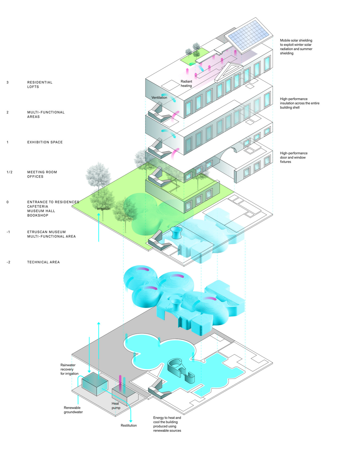 The architectural odyssey that spans seven stories and traverses through time and culture, bridging the realms of life and the afterlife, the past, present, and future, presented a formidable engineering feat. Mario Cucinella reflects on the daring challenge, recounting a point in the Fondazione Luigi Rovati’s timeline when the building appeared to hang suspended mid-air.This precarious phase coincided with the excavation of the underground museum and the service floor beneath it, requiring the superstructure of the palazzo to be perched on slender temporary foundations.