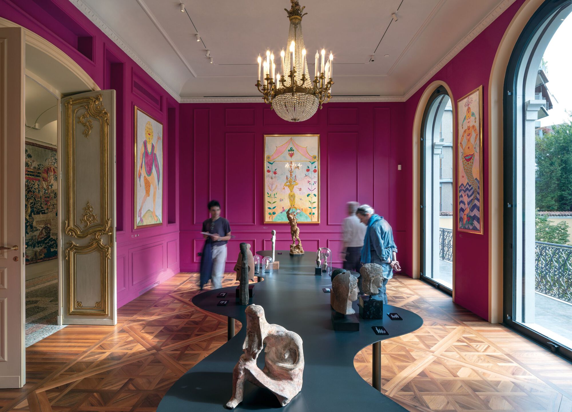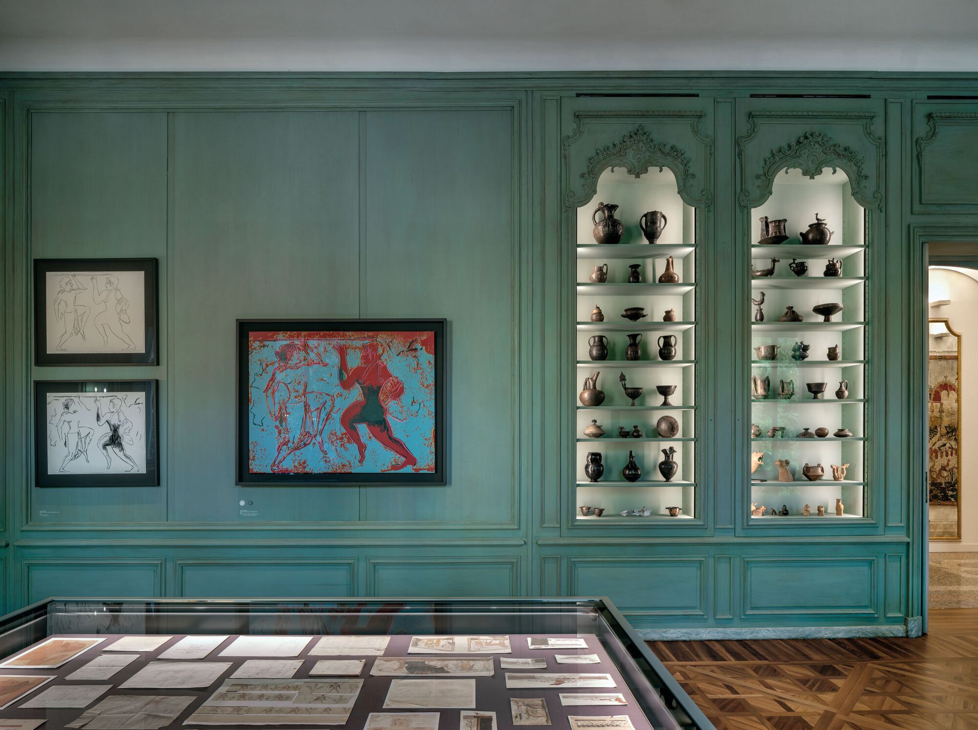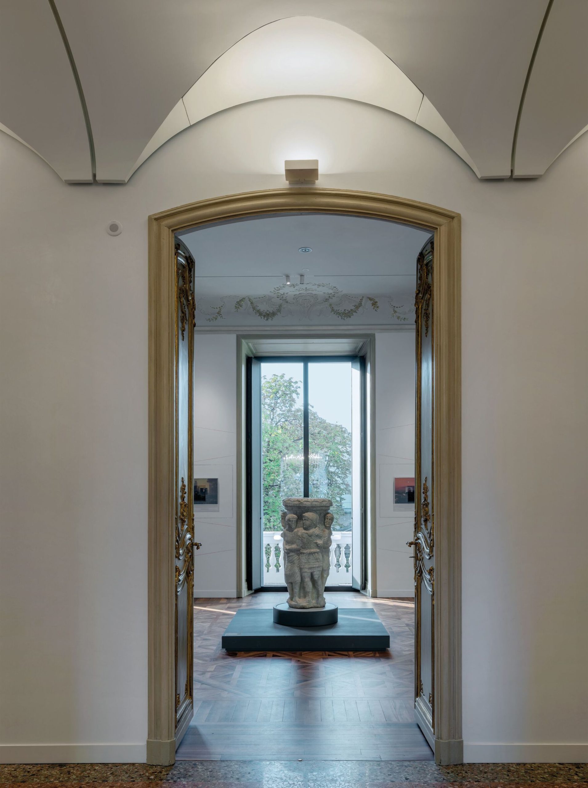 Within the underground “Hypogeum Floor” directly beneath the palazzo, the Foundation’s remarkable collection of ancient Etruscan artifacts takes center stage. Approximately two hundred highlights are showcased, carefully curated within these ethereal spaces, and presented in custom-made cases by Mario Cucinella Architects. Among the treasures on display are cinerary urns, vases, jewelry, and bronzes, notably the celebrated “Cernuschi Warrior,” a votive warrior god dating back to the late 6th century to the early 5th century BC. The exhibition also harmoniously weaves in works by contemporary artists such as Alberto Giacometti, Pablo Picasso, Arturo Martini, Lucio Fontana, and William Kentridge alongside artifacts spanning two to three millennia.
