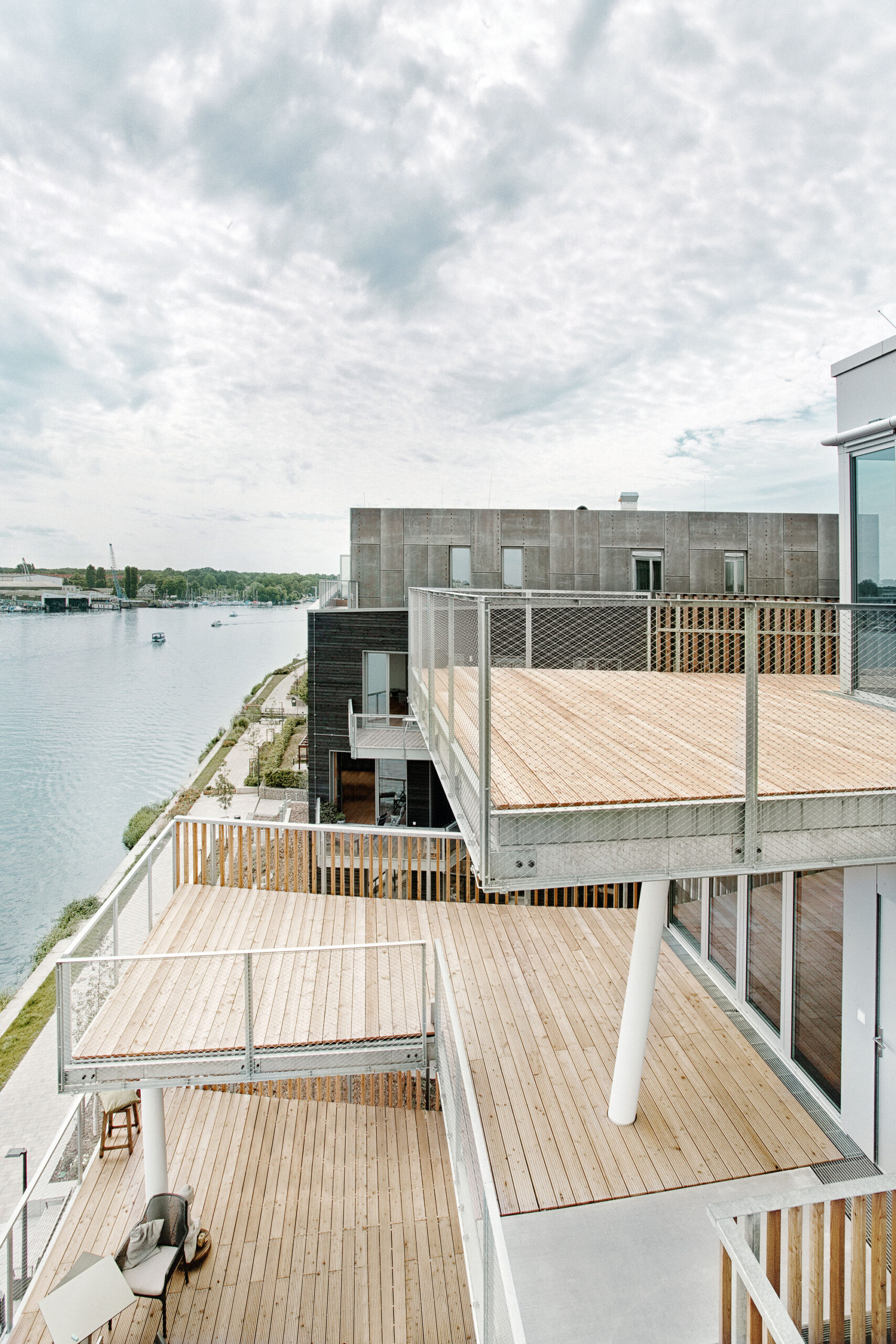 To stage this unique natural quality to the maximum is the central design idea of the residential building: A large-scale, eight-meter-deep pier in front of the actual Building leads the individual apartments very close to the water – so that Apartment and water seem to merge. The jetty is a hybrid of private balconies or open spaces and at the same time a development element. Thus, the footbridge stands for view, leisure, recreation, Pleasure, enjoyment, but also for social interaction, community, and sense of togetherness. It “stands” for a kind of bathing lake effect.
