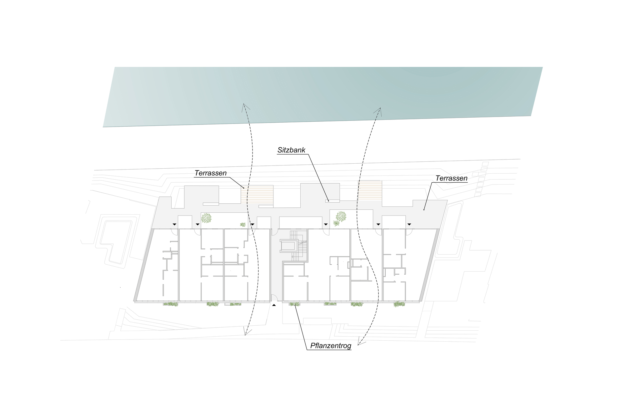 In the center of the house is the vertical access, which is directly connected to the footbridge. The footbridge, which is set back about 2 meters from the house, leads the residents not only directly to their apartments but also to their spacious outdoor areas with spectacular views over the river. The individual levels of the walkway have different floor plan layouts. Thus, in addition to the diverse vertical view relationships, there is also an interesting and always new shadow play. All the residential units of the building are designed in an interconnected way and thus have two sky directions each: the north-east located pier and a south side, which is equipped with large-format plant troughs for free.