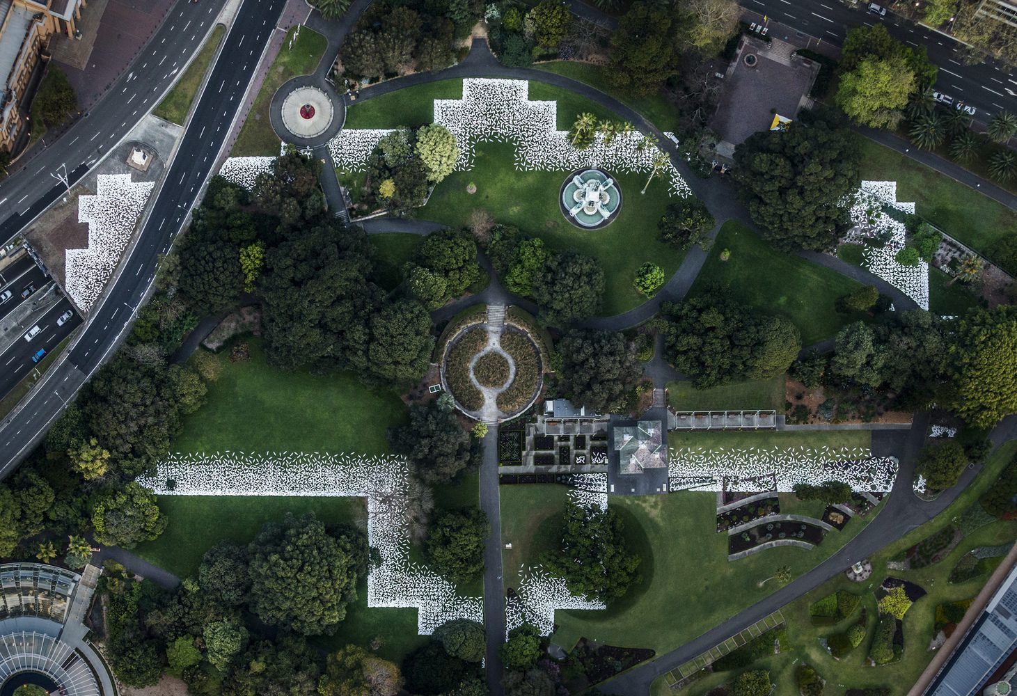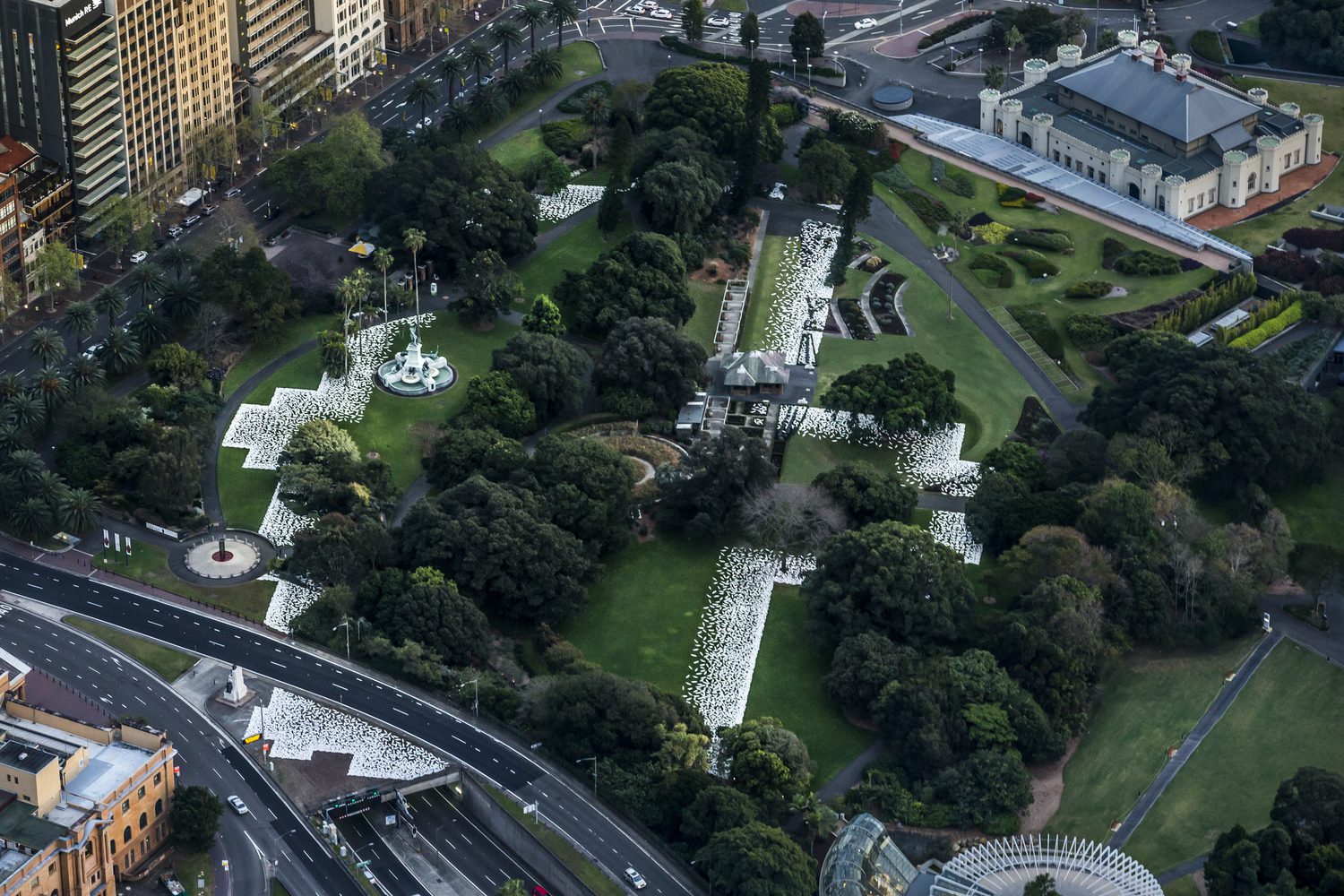 Kaldor Public Art Projects collaborates with the artist Jonathan Jones,and created barrangal dyara (skin and bones), in Sydney, Australia. Inspired by the history of the 19th century Garden Palace building, which originally stood in the Royal Botanic Garden from 1879 to 1882 before burning to the ground, the artwork marks the original footprint of Destroyed Palace with a sculptural installation of 15,000 white shields spanning 20,000 square meters.