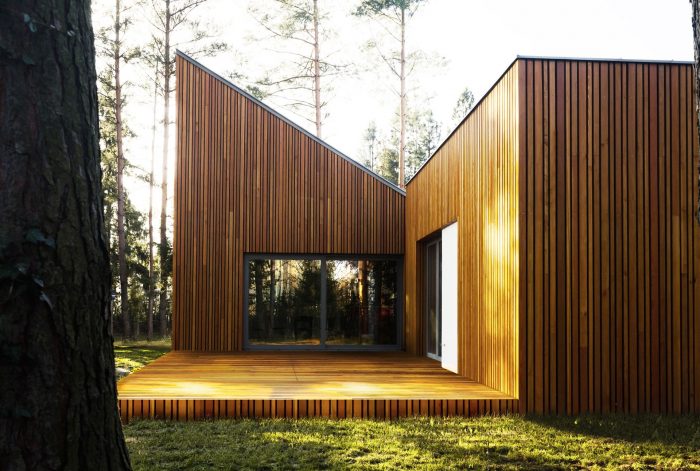 The development area is located at the edge of a pine forest among holiday homes, which naturally inspired the choice of the facade cladding of the designed house. In combination with a simple but original shape, besides meeting the investor’s expectations, perfectly fits into the unique location.
