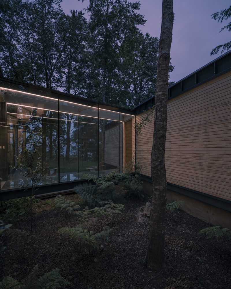 Regarding materiality, the project’s starting point was the idea of a burned log, where the bark protects its interior. Extrapolating this image to the house, the metallic cladding protects the acetylated wood of the intermediate facades and the pine of the interior walls.