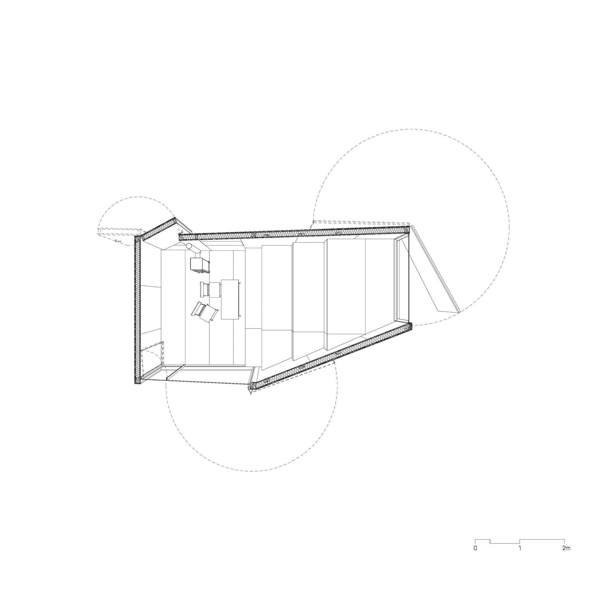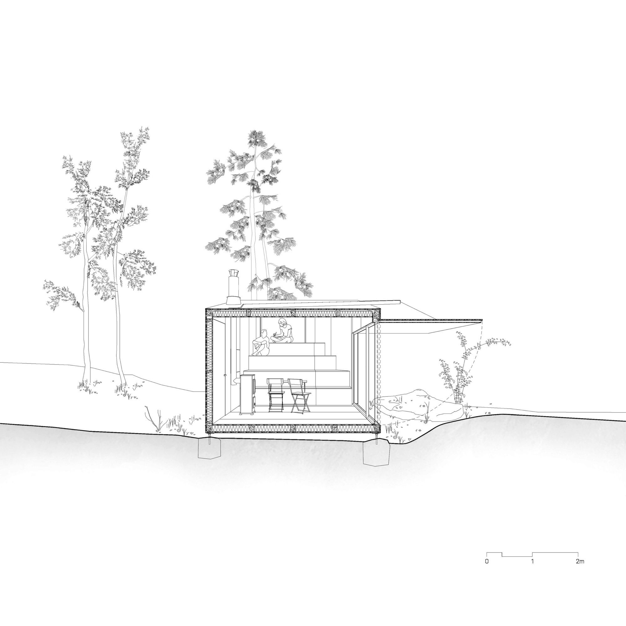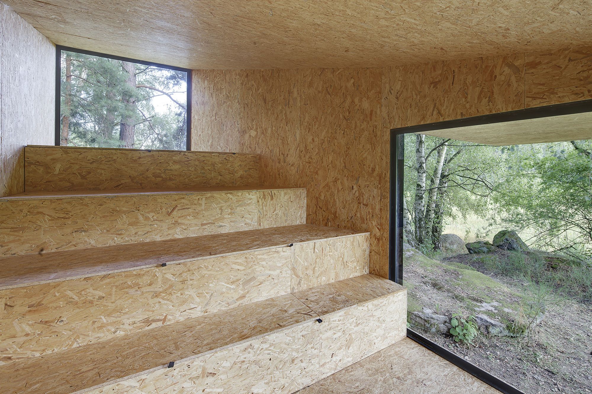 The remaining part of the object rises gradually towards another opening, facing the tree crowns. And there is a unique place for resting. Each step can be used as a sleeping place. Under them, there is storage space; turning one of the benches over creates another double bed. Multifunctional space is suitable not only for dwelling but also smaller events, performances or just meditation. Both glassed-in openings can be closed by big shutters, the bigger one by a pulley and a hand winch.