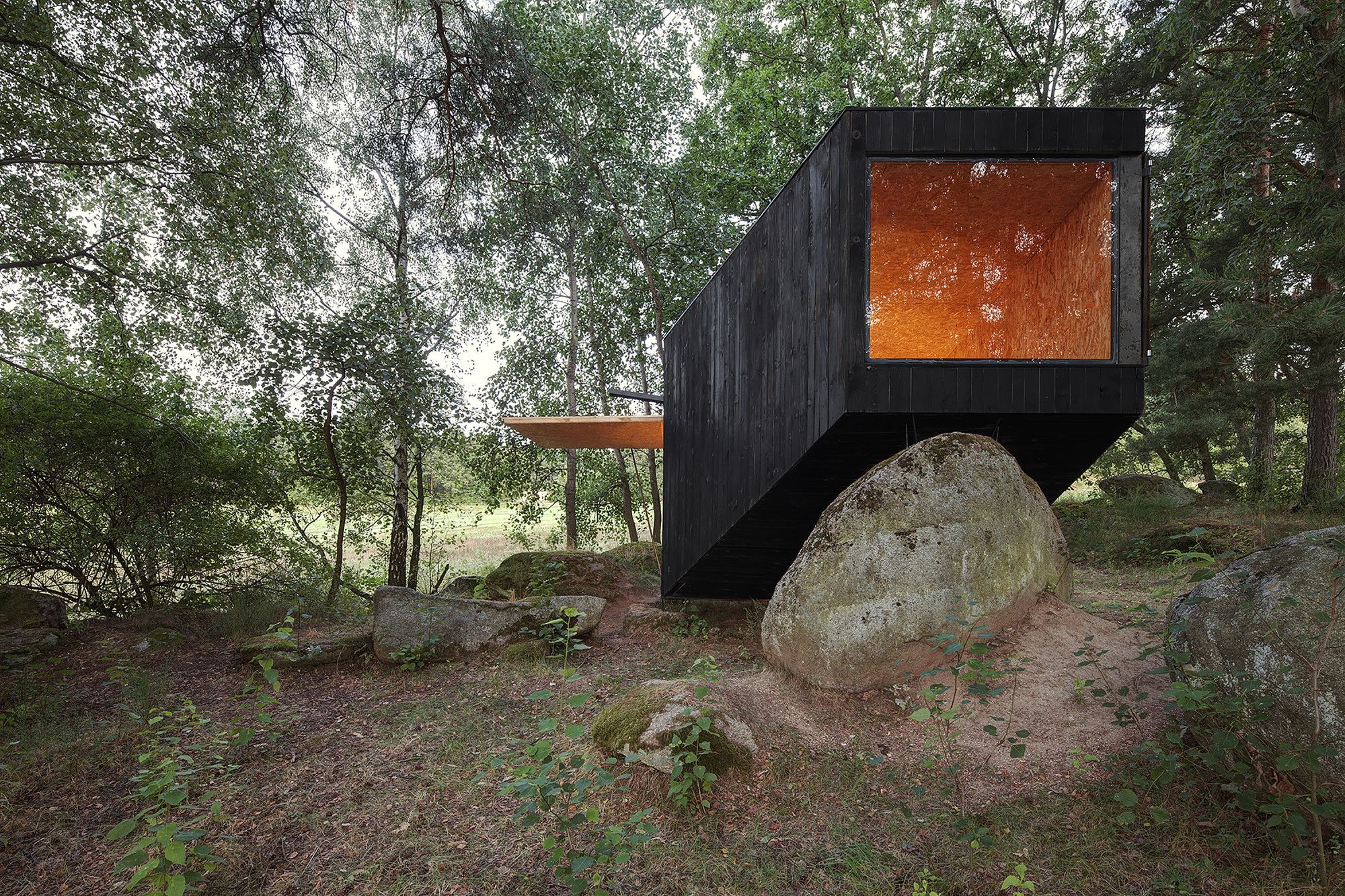 Designed by Uhlik architekti, Our client contacted us with an idea to create a hideaway in the countryside where he could “hole up” and gather strength for his demanding work in Prague. We set off into an area between Central and South Bohemia where he comes from and where he has loved going to since his childhood. He took us to a spot in the midst of fields, woods, and meadows, full of strange boulders, to a remote and somewhat forgotten place.