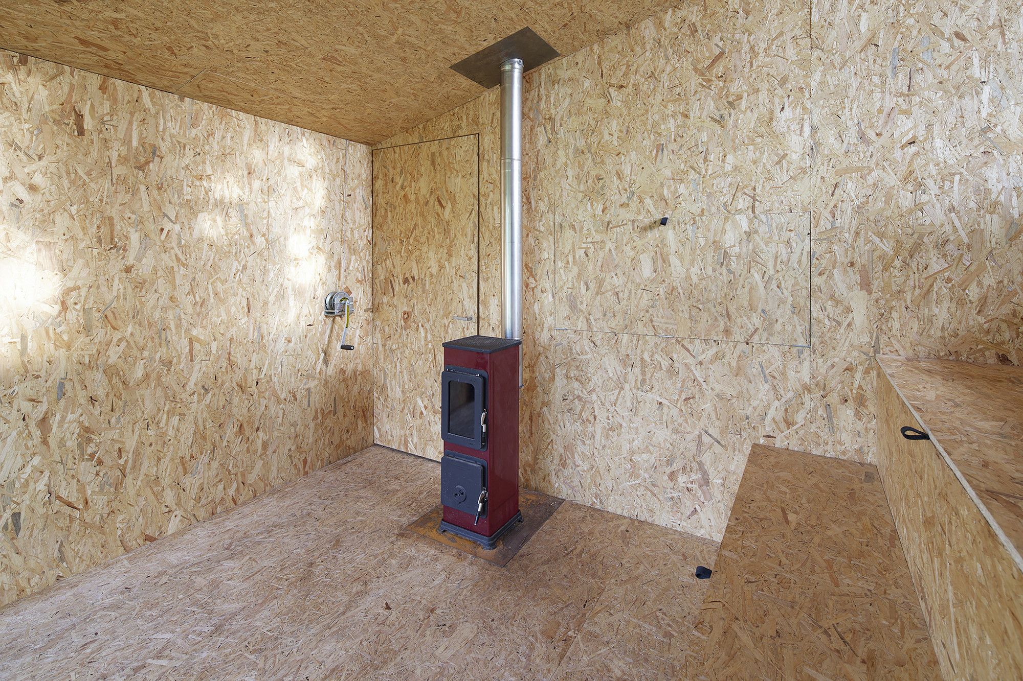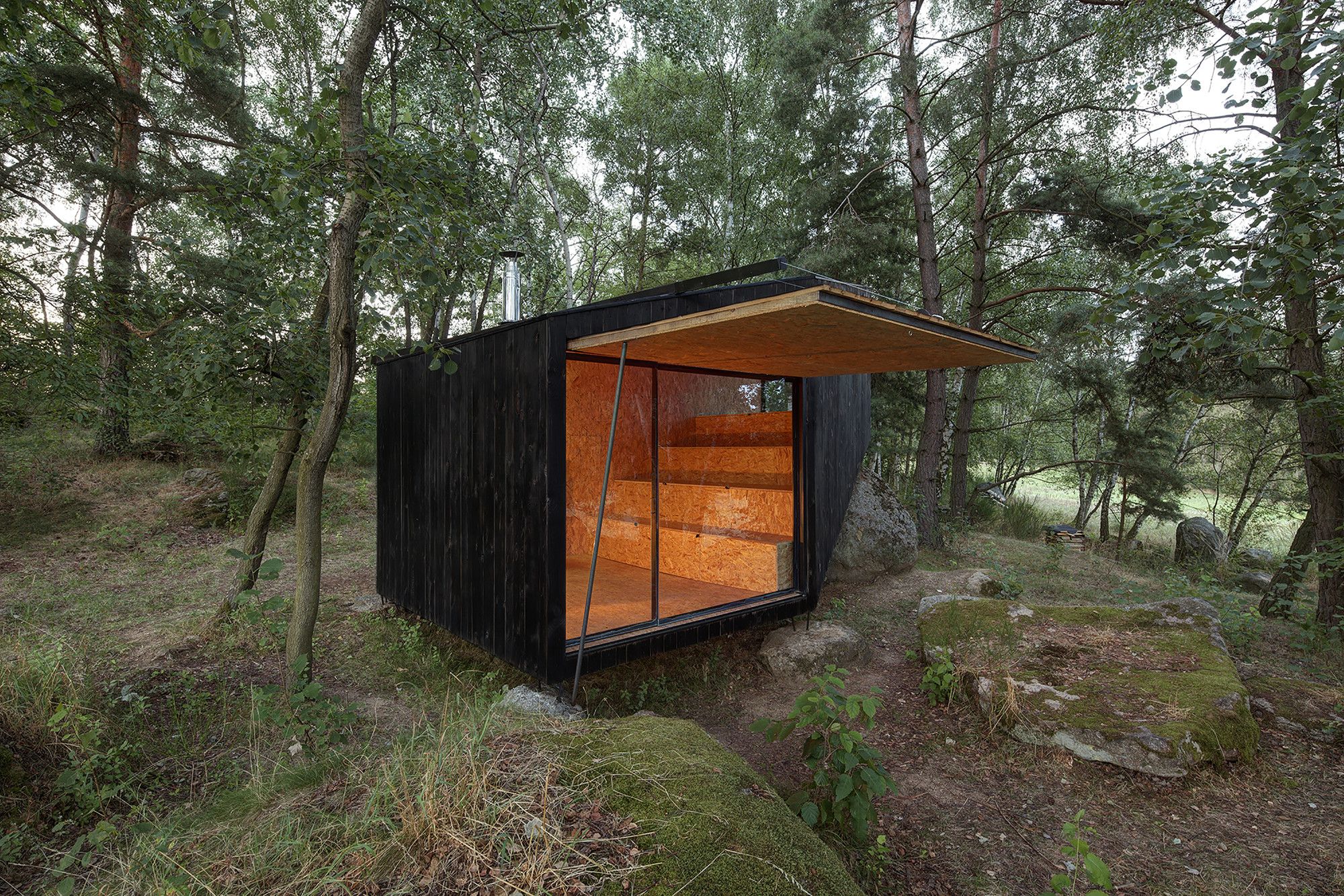 The basic supporting framework of the forest retreat is a joist construction which emerged from the cooperation with local carpenters. The outside is covered with charred boards with rabbet joints. The wood for boards and joists was taken from fallen trees from the owner’s land. The inside of the construction is coated with OSB boards in order to reinforce it and also with respect to the low price. The roof is covered by two layers of asphalt belts.