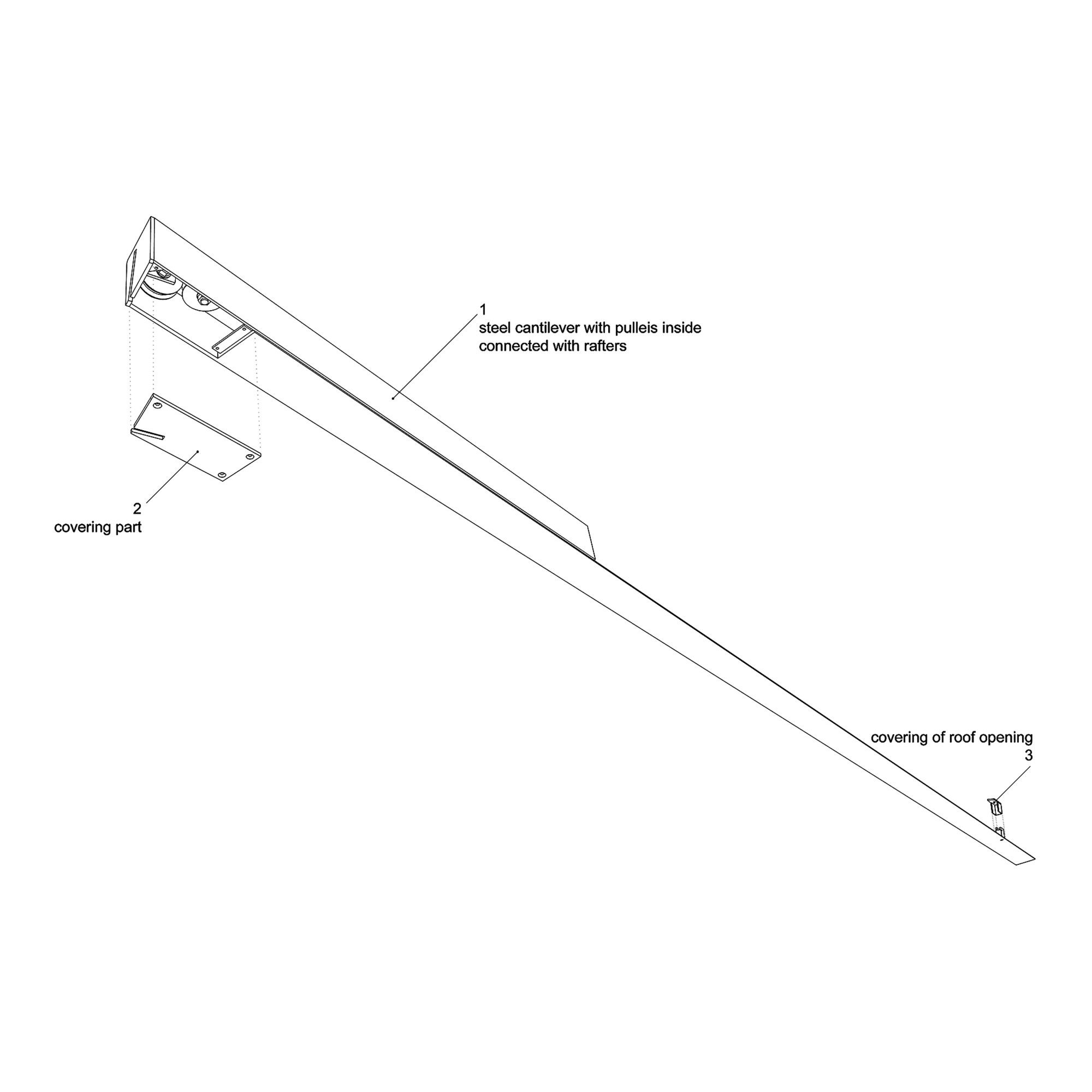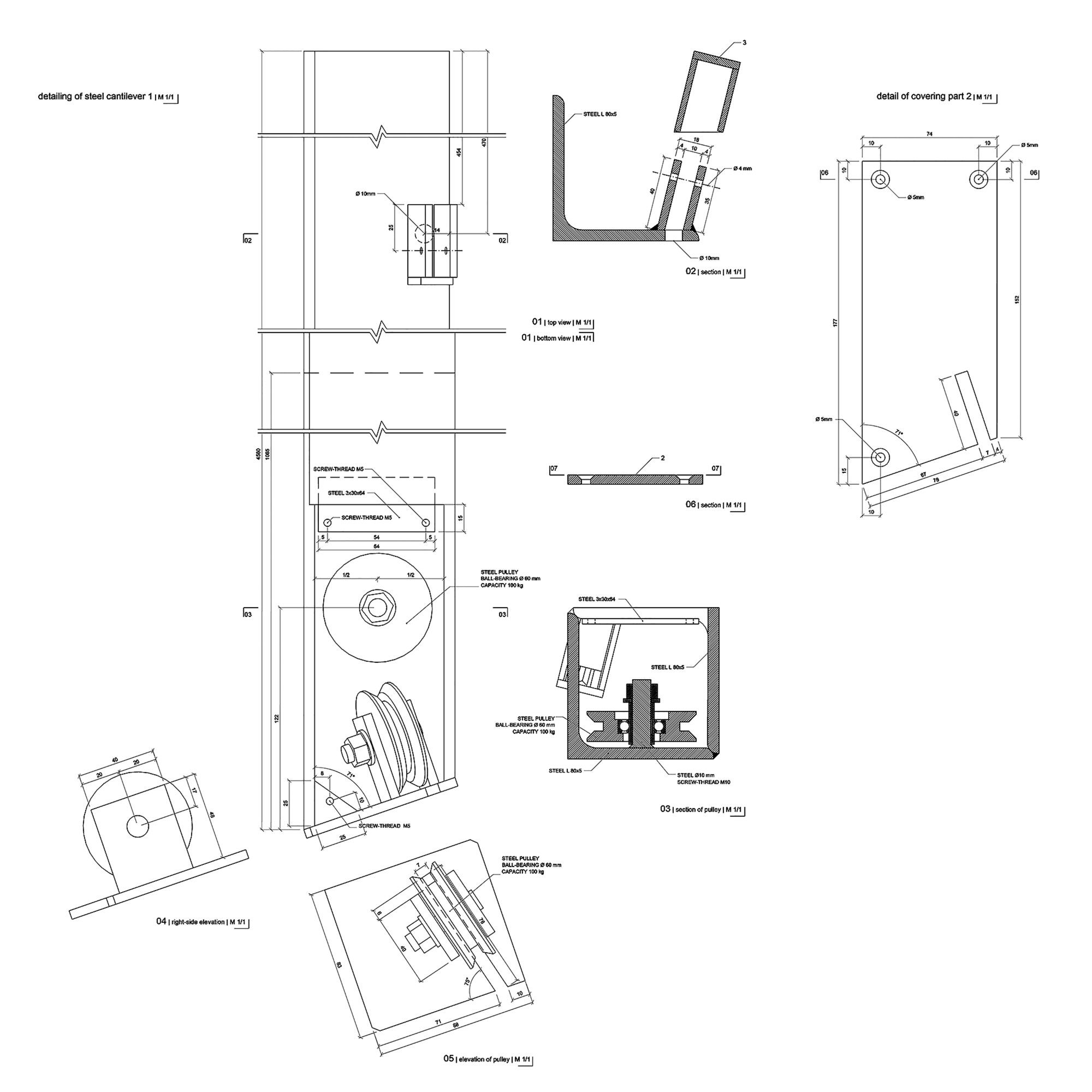 The drainage of a roof is secured by a steel L profile, placed obliquely, which serves at the same time as a rail for attaching the idler pulley wheel. All steel components were prepared according to our documentation by a blacksmith from a nearby village. The building was assembled during a few extended weekends between the autumn 2012 and spring 2013.