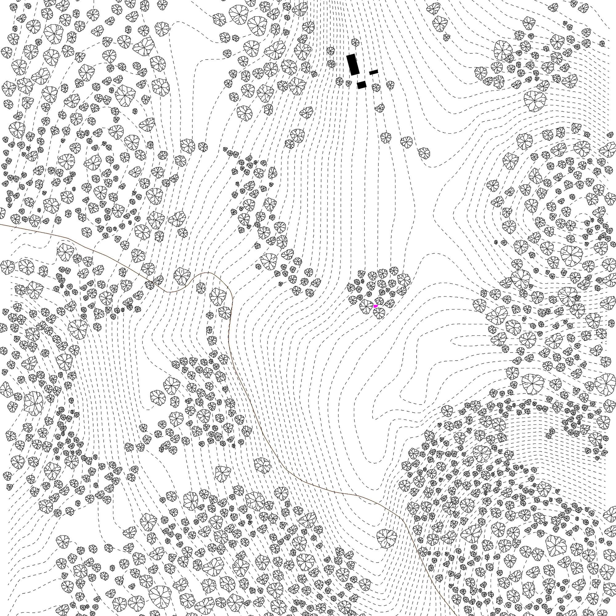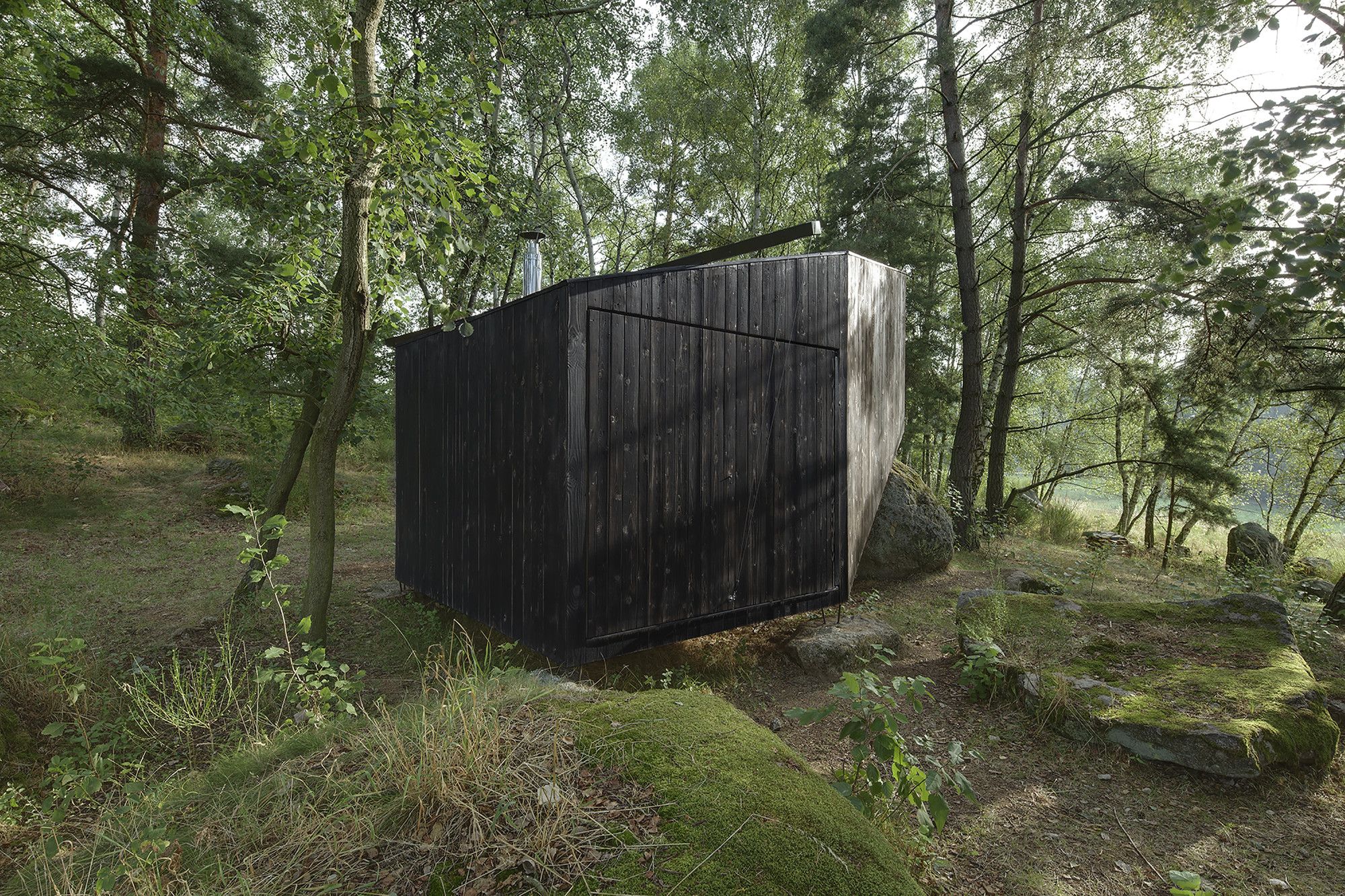 We designed a compact enclosed volume – an object resting freely on boulders with a stern raised on a huge boulder. The enclosed black object made of charred wood contains one interconnected space with the dimensions of 3.1m x 5.8 m. In the entering part is a flat platform with headroom just for a standing person; this part is opened by a large glassed-in surface offering the view.