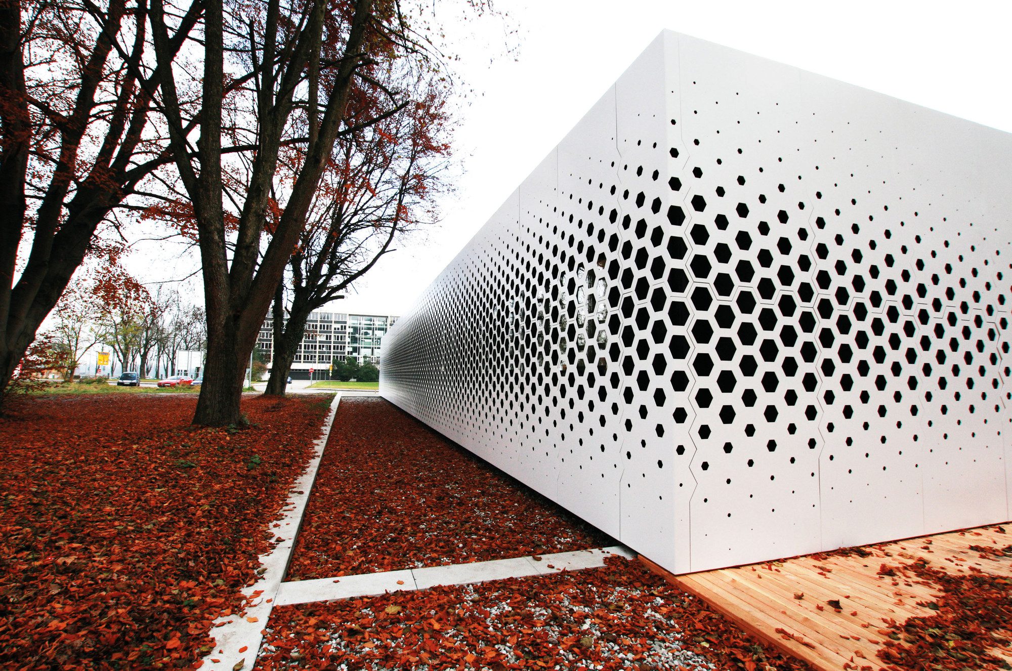 At the entrance of Campus “Netzwerk” in the Bavarian town of “Töging am Inn” in South Germany, stands this one storey building that shows a different approach done with aluminum in a changing industrial region. The design was done for an aluminium company’s HQs. Format Elf Architekten created a gently running honeycomb structure over the facade, calculated in a parametric process that gives the building its contemporary appearance. These honeycomb holes allow for allow comfortable daylight access to the offices inside. Glazing runs the complete length of the other long facade, which is set back and framed by a band of aluminum.