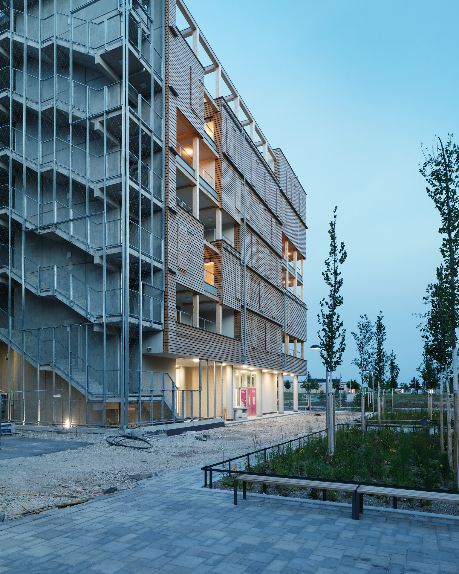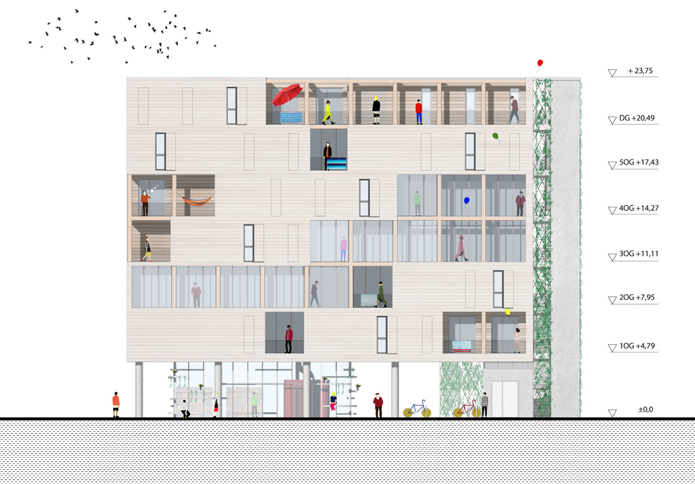 On the upper floors, various combinations of prefabricated basic modules of different housing typologies are created. Output modules, extensions, spaces that can be connected if required and terraces offer a variety of possibilities. Small entities can be used as mini-labs, micro-working units, or shared infrastructure, they are integrated in the structure in the same way as a big area for activity-based-working on the top floor.