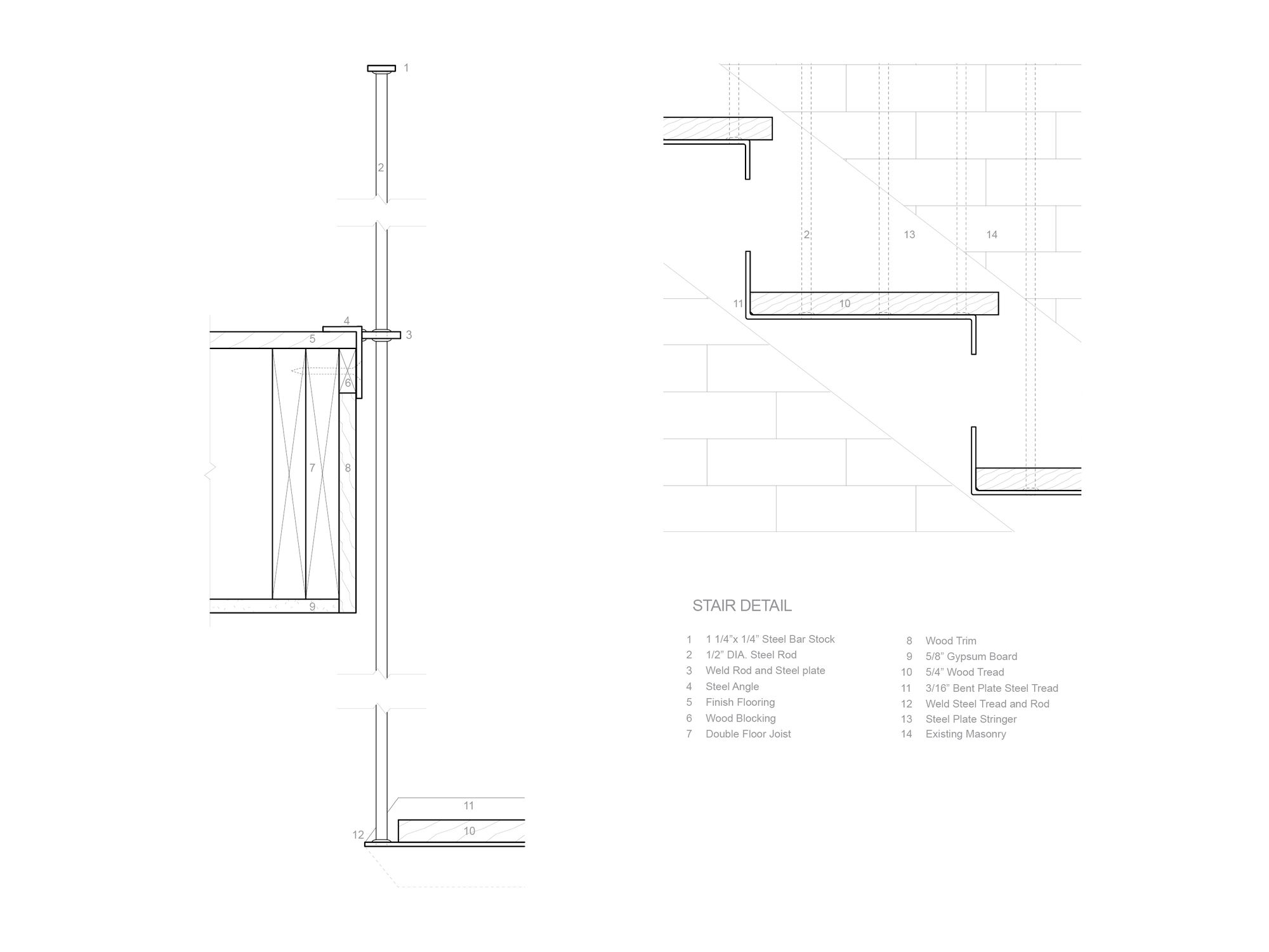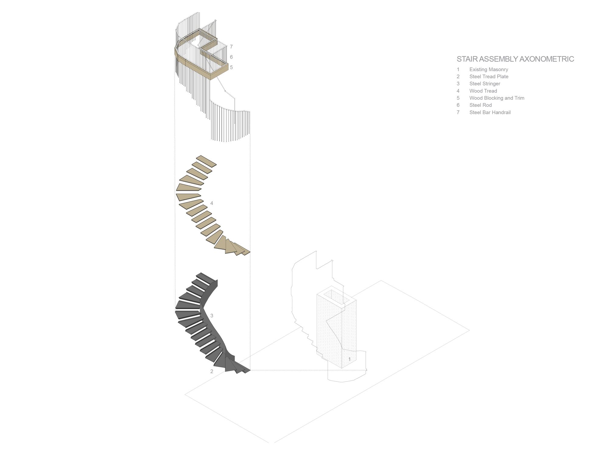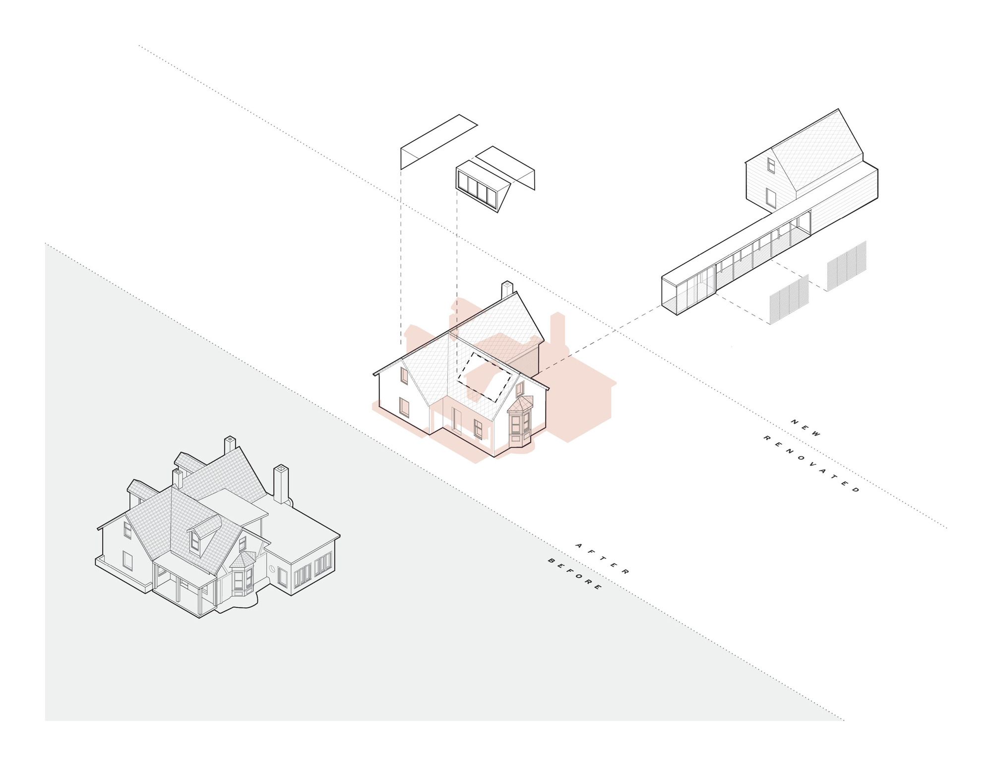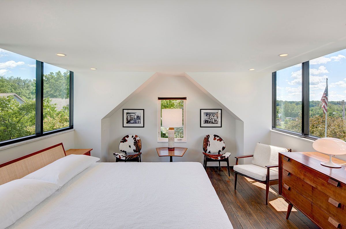 The retreat’s modest exterior belies the spaciousness of the main floor. Masonry and timber are left exposed, while new surfaces receive variations of white. Details are minimized to let wood, brick, steel, and light converse. A remnant of the original masonry fireplace anchors the composition, skirted by a suspended steel stair. The stair provides access to the bedroom suite above, tucked within existing roof geometries. Fully-glazed dormers provide essential headroom, bathing the attic in light and framing views of trees and sky. The intimate suite includes a bedroom, bathroom, and laundry/closet.