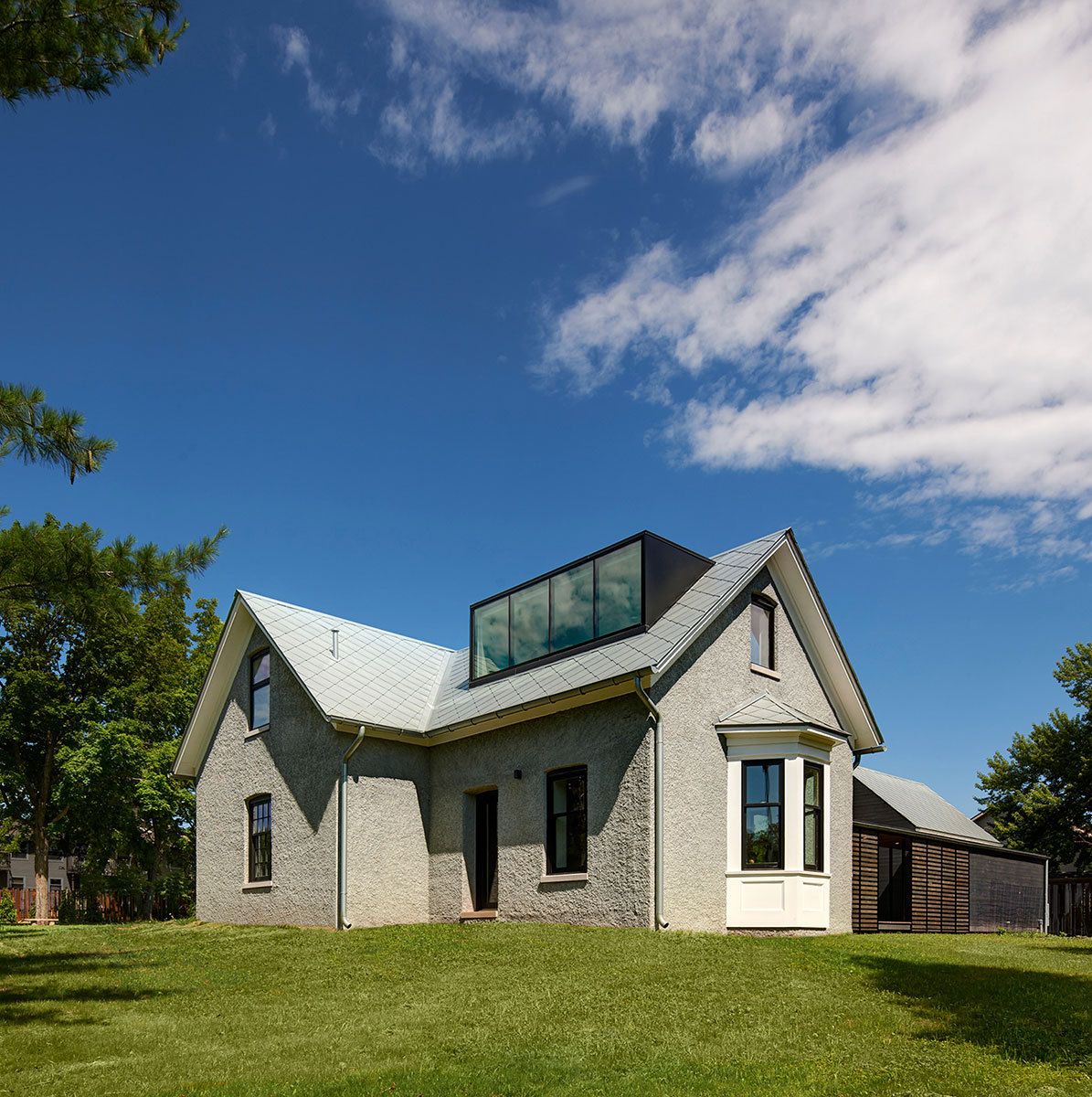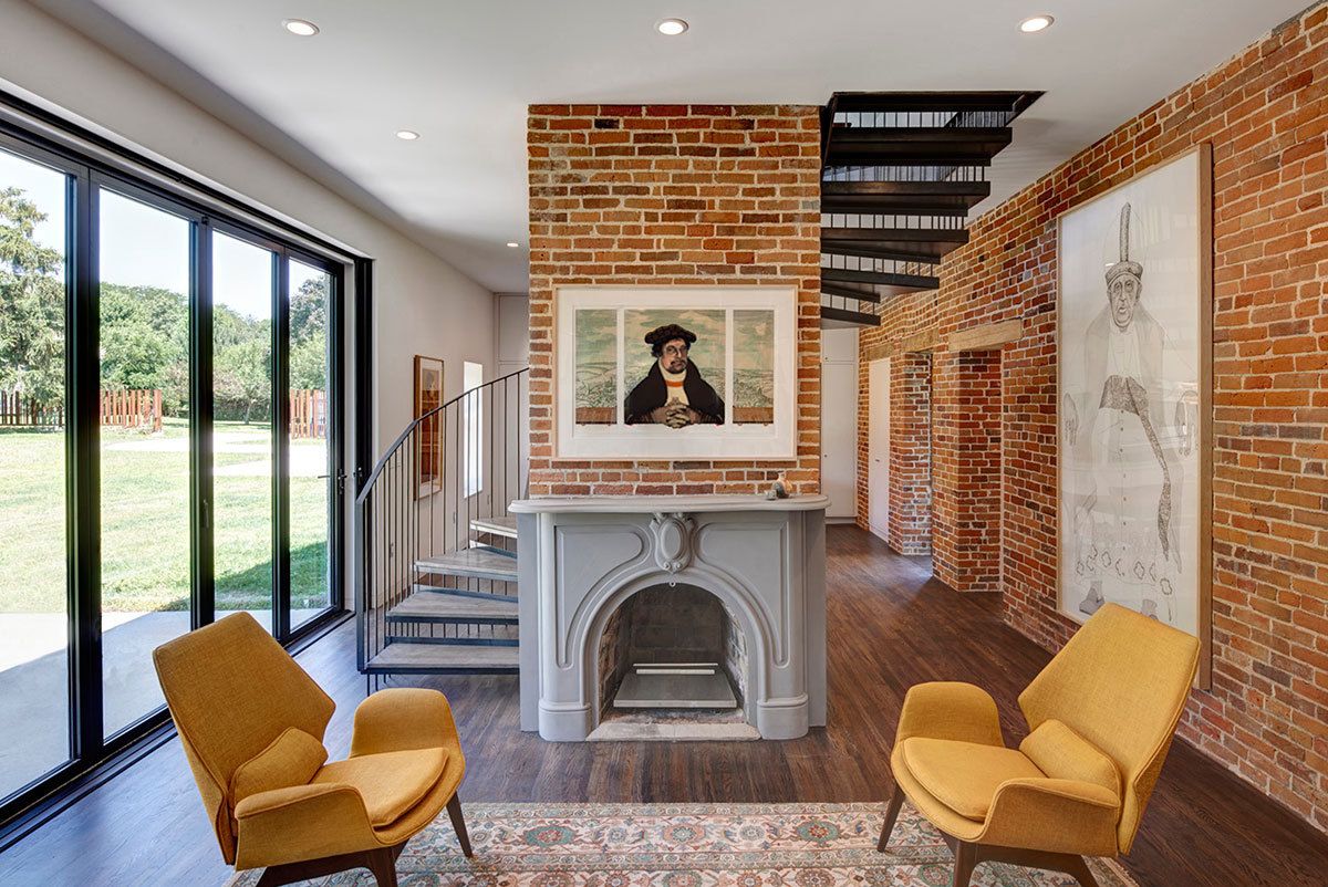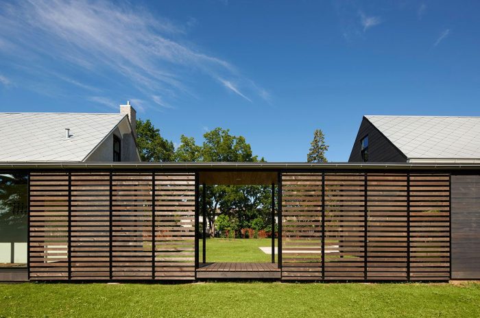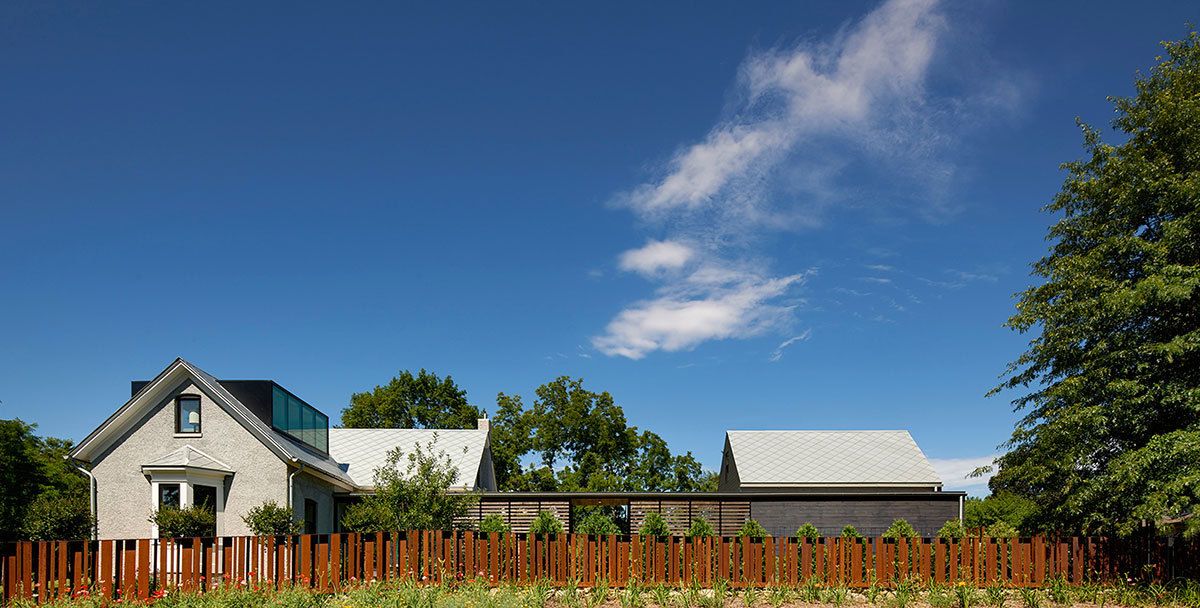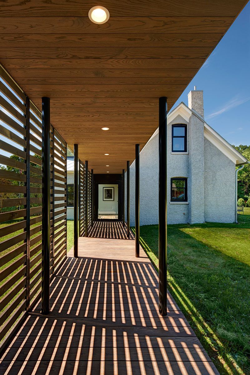 Foster Road Retreat designed by Neumann Monson Architects, The retreat for an urban developer integrates minimalist elements into a modest 1850’s farmhouse. Over the years, well-intentioned accretions—ornamental dormers, an incongruous addition, and a cavernous porch—had cloaked the house in a dog’s dinner. Demolishing these elements yields tailored alterations that sympathetically update the house for modern use. A weathered steel fence demarcates the property, its encircled lawn providing a sanctuary of stone paths and shade trees. Although housing developments have replaced the fields beyond, the homestead still strikes a commanding air.