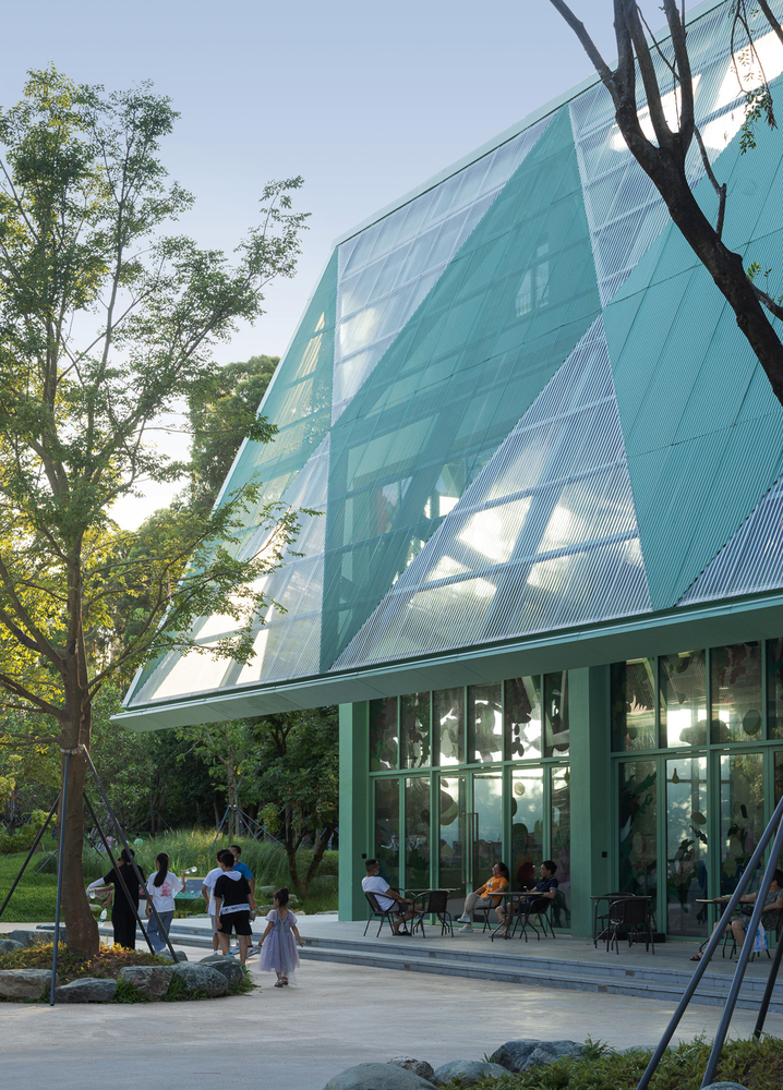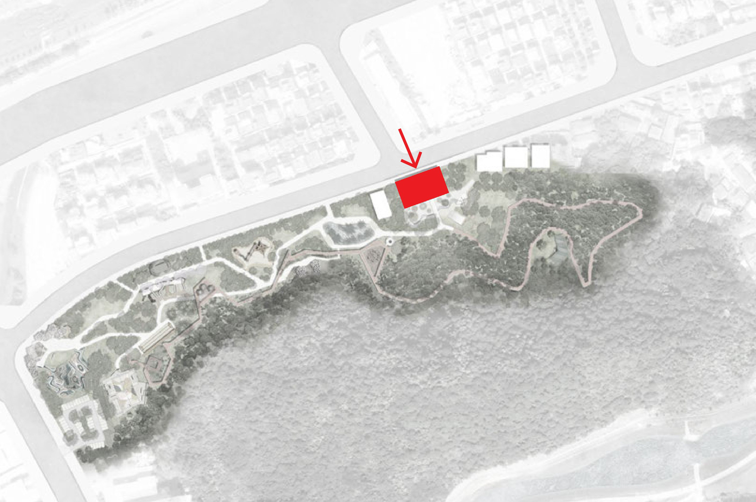 Situated elegantly at the park’s northern corner, the Four-Roof Pavilion is a secondary entrance, welcoming visitors with its graceful presence. This 1,200-square-meter, three-story structure offers a pedestrian thoroughfare, multifunctional rooms, a cozy bookstore, a charming cafe, and a rooftop garden to enhance the park-goer’s experience.