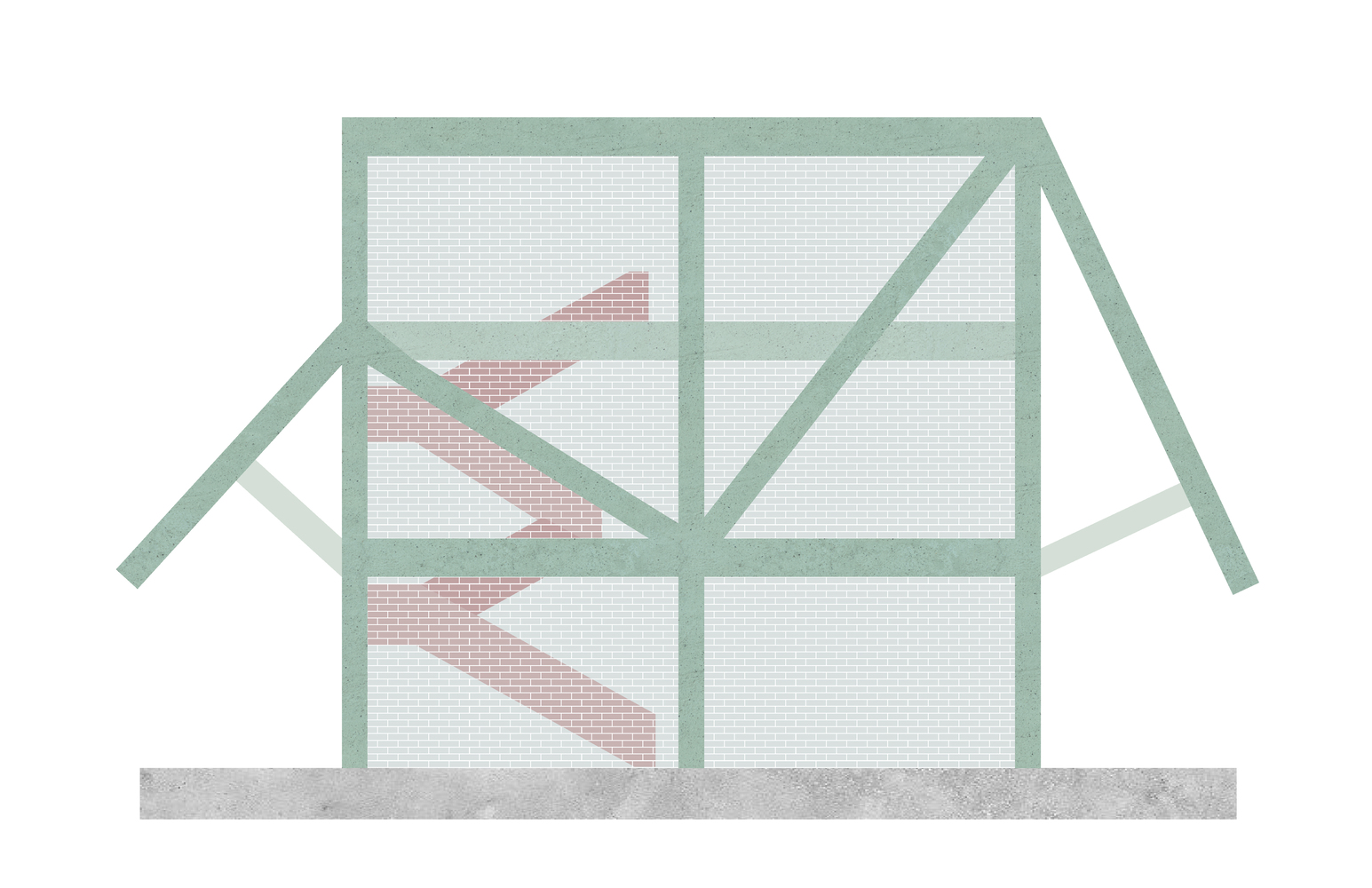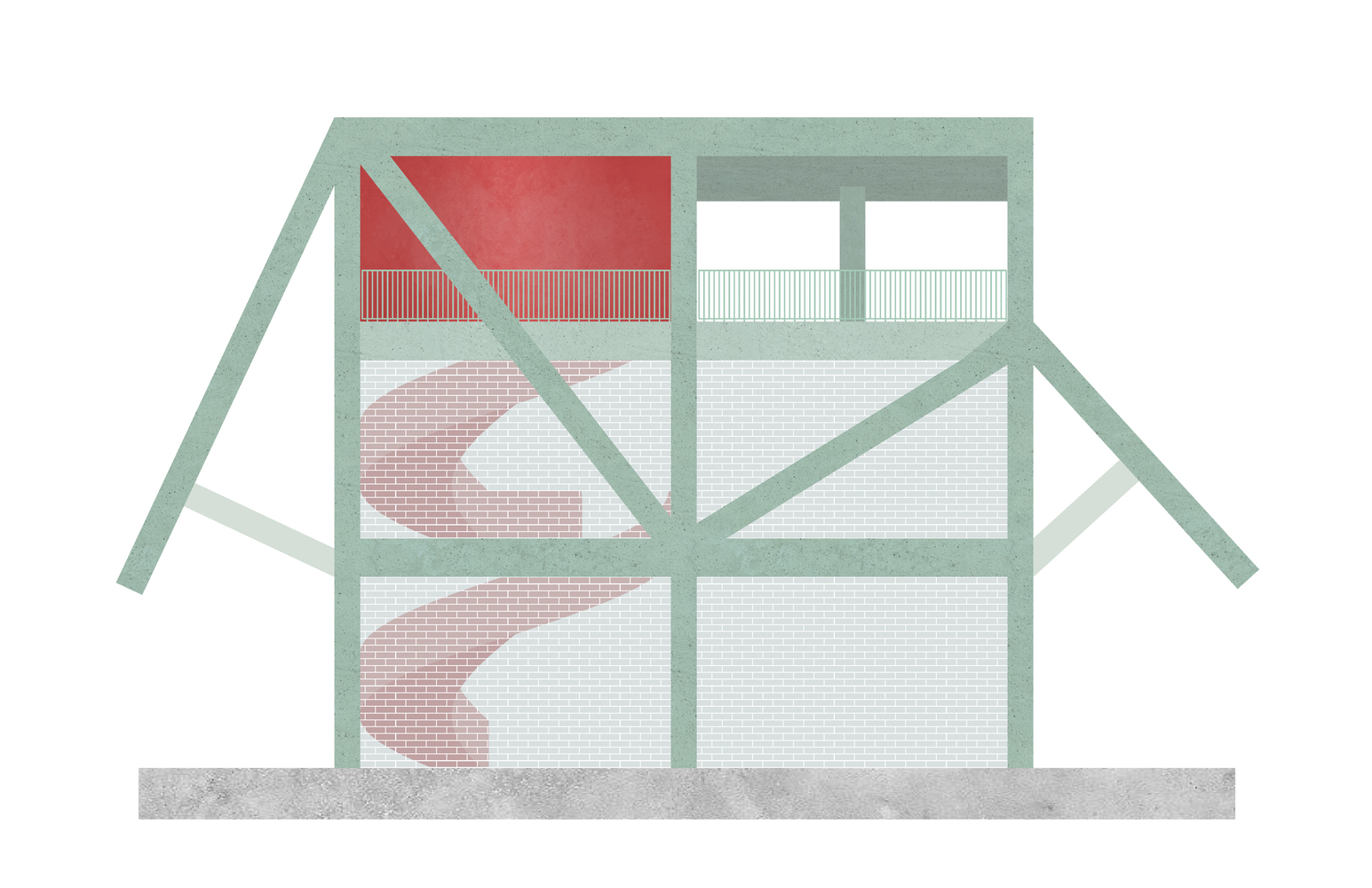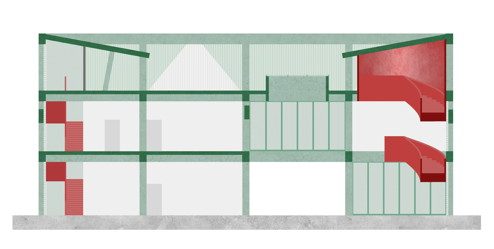 The architectural design showcases a minimalist yet robust cast-in-place concrete structural grid, adorned with two steel roofs on the southern and northern façades and two concrete ceilings that grace the outdoor garden. Drawing inspiration from 11th-century Chinese landscape paintings, the color palette harmoniously blends columns, beams, and diagonal bracing elements. Two striking red staircases are seamlessly integrated within this structure, accentuating vertical circulation.