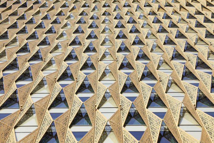 The resulting design reinterprets this tradition, presenting a contemporary take on traditional patterns and forms, via a three-dimensional lattice in various scales and locations across the development. The diamond pattern of the lattice provides solar control for the building. This approach integrates the three main elements of the project by wrapping the east and west elevations of both towers and covering large sections of the podium with a mashrabiya type envelope.