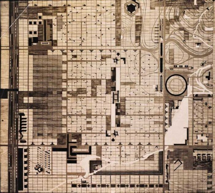 A community plan for Broadacre, with a high school at the center of a pinwheel design. The Frank Lloyd Wright Foundation Archives – Courtesy of MoMA and Avery Architectural & Fine Arts Library, Columbia University, New York