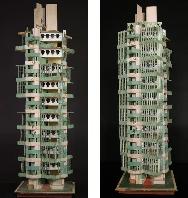 The design, mixing apartments with offices, was built around green spaces. The Frank Lloyd Wright Foundation Archives – Courtesy of MoMA and Avery Architectural & Fine Arts Library, Columbia University, New York