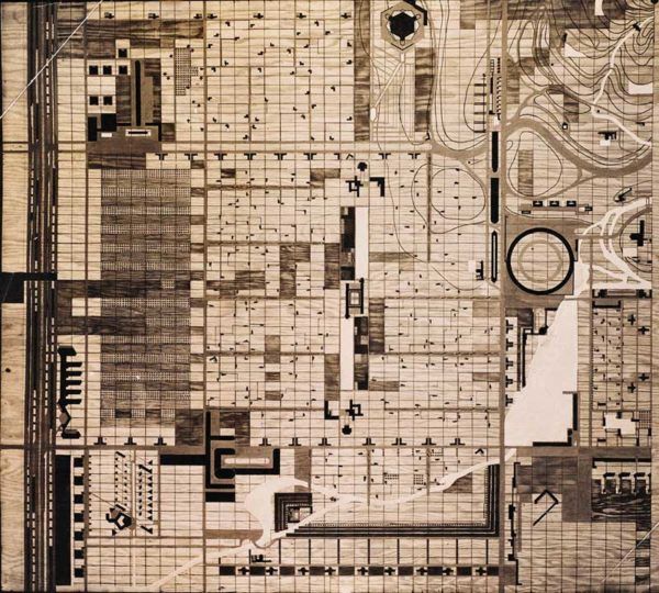 A community plan for Broadacre, with a high school at the center of a pinwheel design. The Frank Lloyd Wright Foundation Archives – Courtesy of MoMA and Avery Architectural & Fine Arts Library, Columbia University, New York