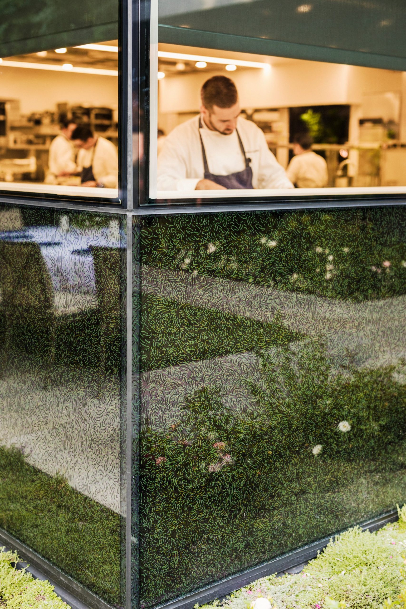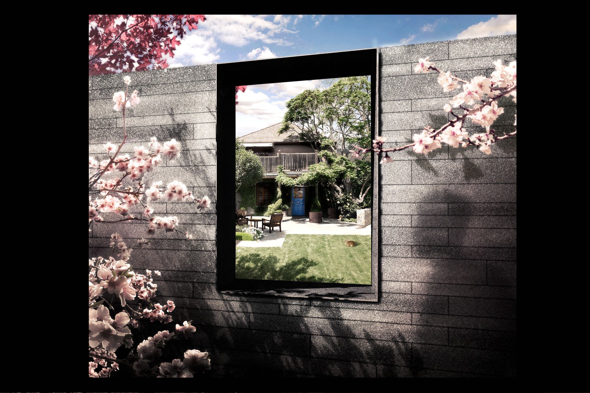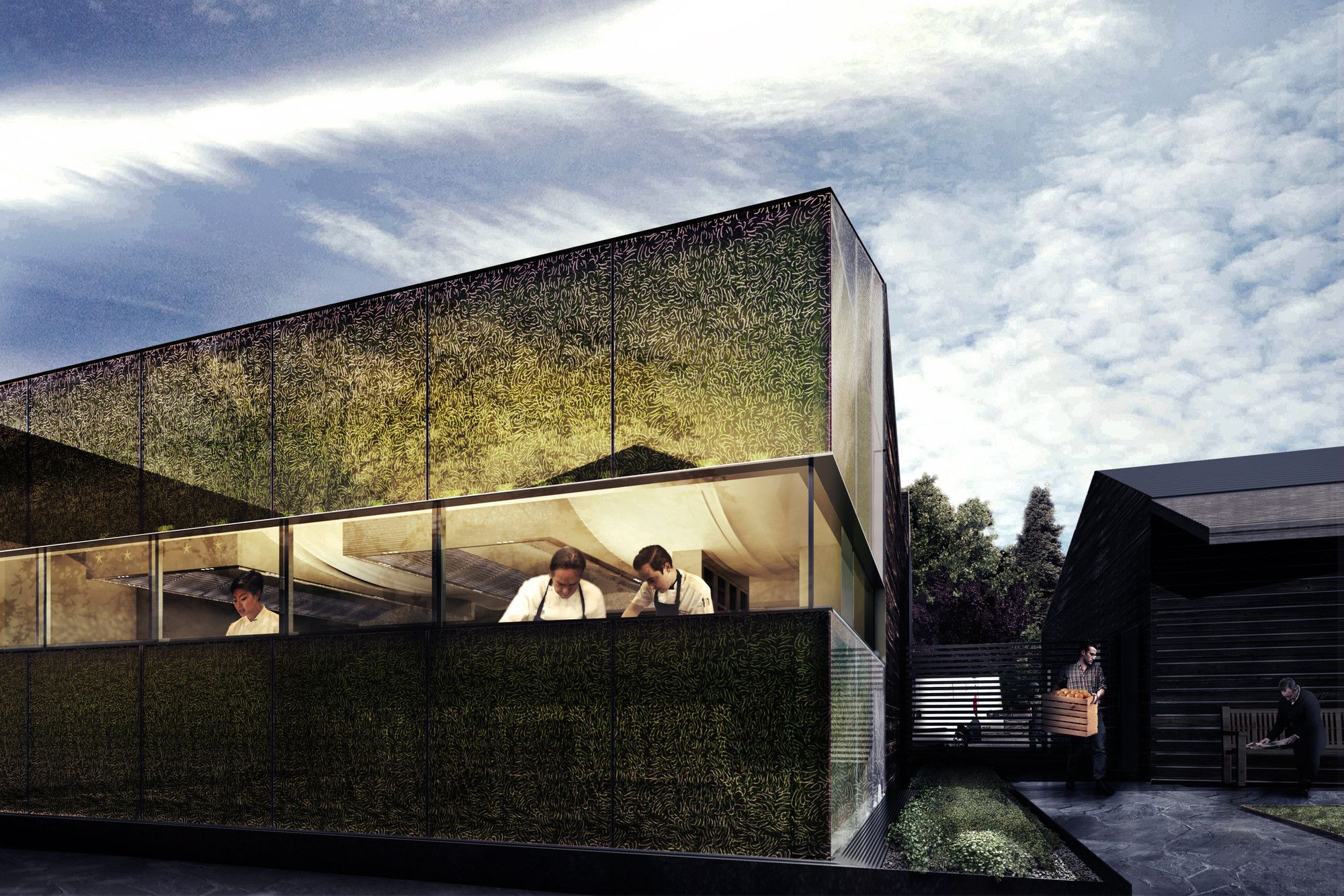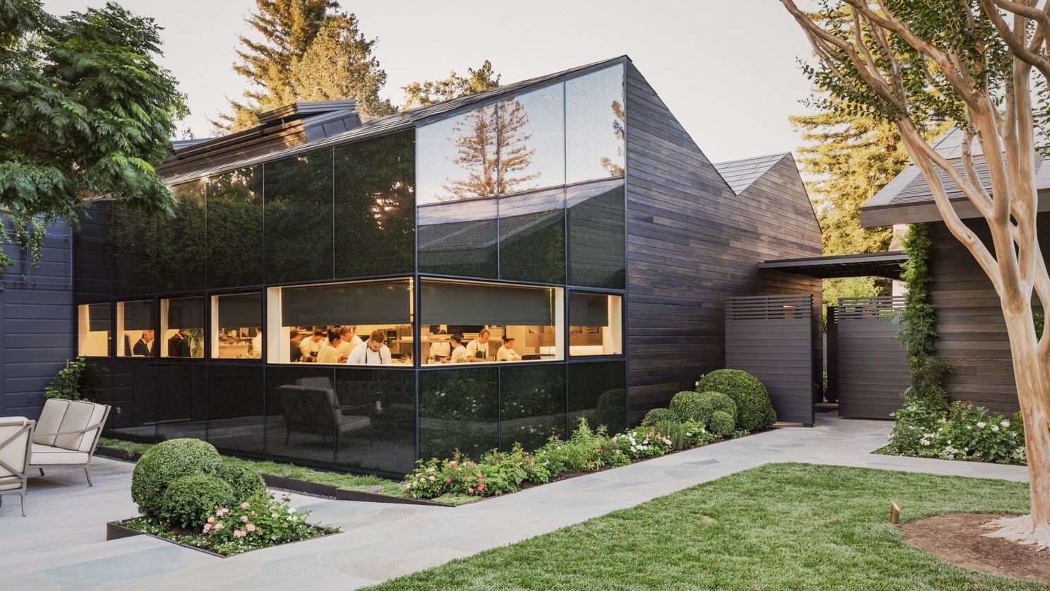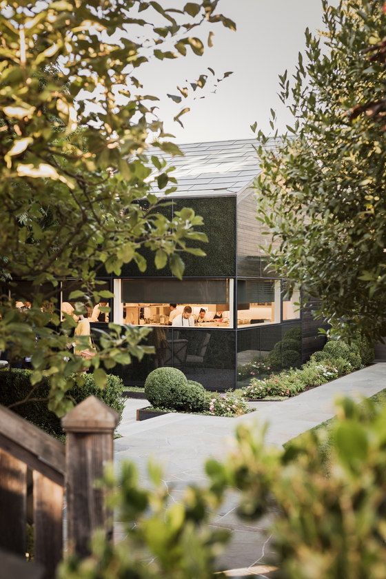 The plan also include the ground-up construction of a new Kitchen Annex that will house The French Laundry’s support functions including the Test Kitchen, butchery, produce breakdown, and management offices. It is also home to The French Laundry’s regarded wine collection, with the storage capacity to hold up to 14,000 bottles. The garden will double in size with the new design. Arriving at The French Laundry, guests will be met with the scent of almond blossoms from the trees lining the courtyard. A path of concrete pavers set within fine gravel leads visitors through the portal of a tall stone garden wall into the heart of the garden. Here, guests are greeted by the French Laundry’s iconic blue door and glow of the kitchen at work, visible through the ribbon window of the new Kitchen’s fritted glass walls. The garden is framed by the historic French Laundry building, and new wooden-clad structures.
