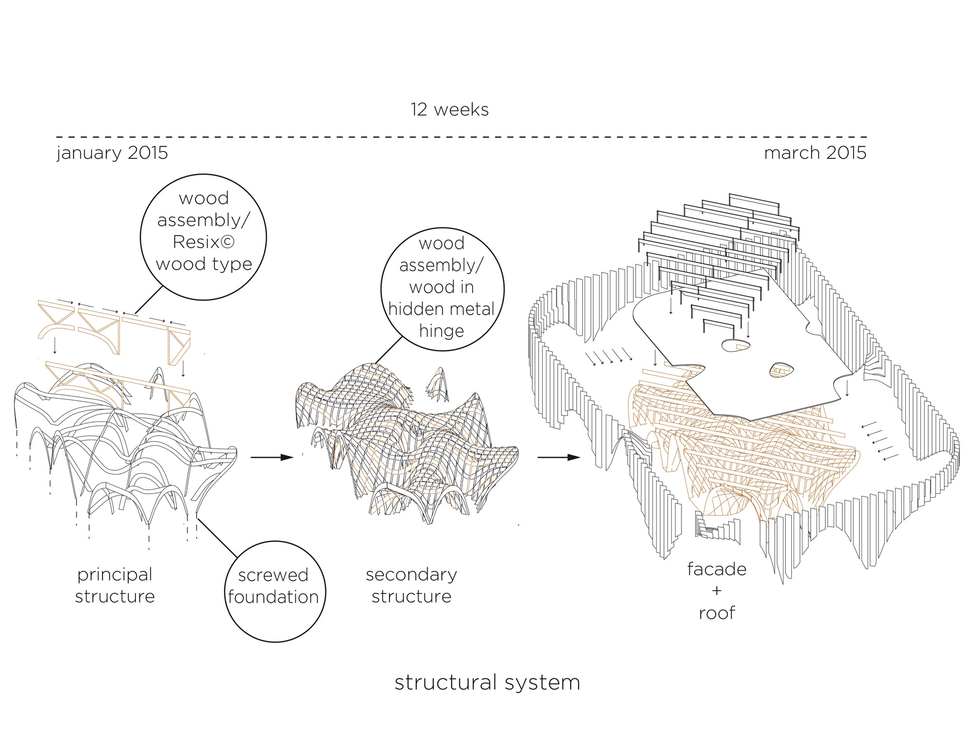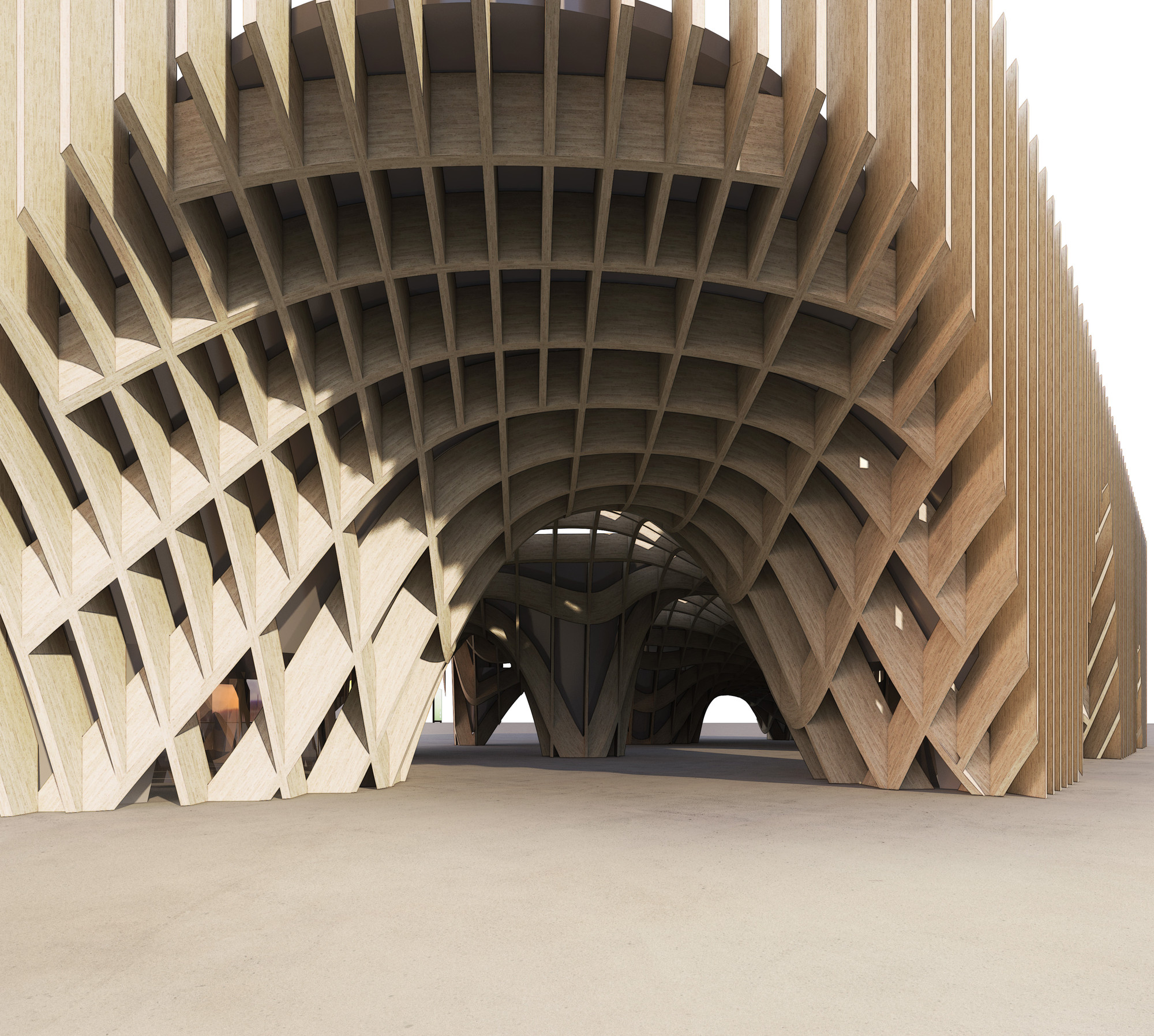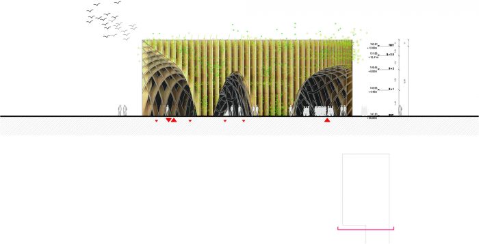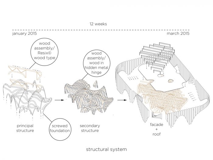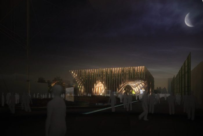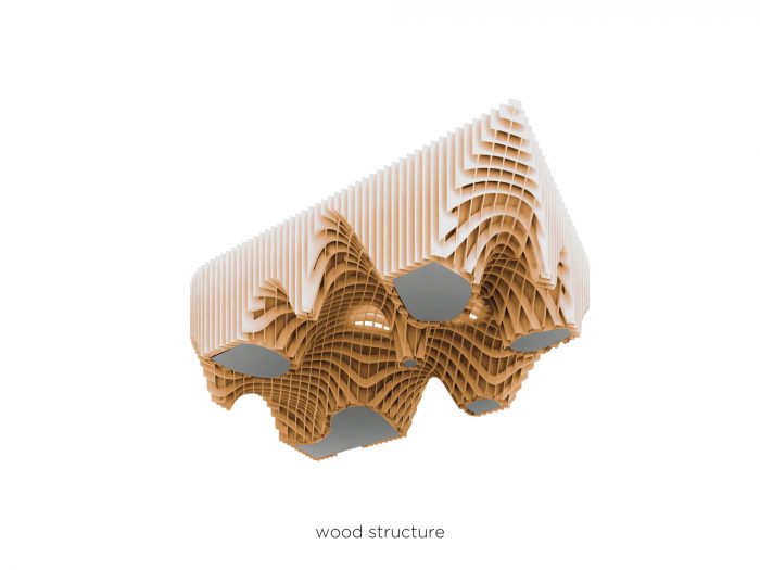 “At the time of short-circuit retail, reinterprets the market model once a place of exchange, tomorrow’s market will be a place of production to be consumed on the spot,” said the design team. Using the appropriate advanced fabrication mechanisms, crossing layers of timber wood that accord to the pavilion its characteristic ridged framework.