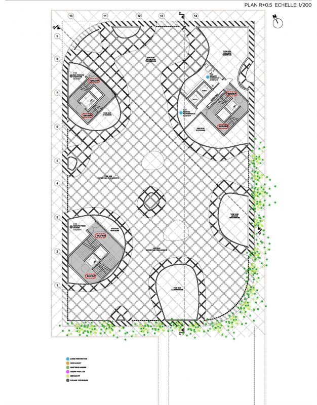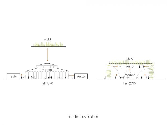 “Below the horizontal roof, the Great Market presents it as a reversed and spectacular landscape that makes the buzz, a landscaped ceiling that evokes the French identity born from territories,” said the studio.