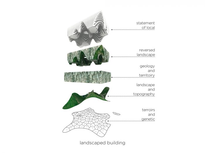 Furthermore the designers hope that vines of hops will deteriorate through the voids in the lattice, while the curved hollows enclose the interior zones. XTU Architects envisaged the underside of the waiving ceiling as a top-down landscape that imitates the “rolling hills of the French countryside”.