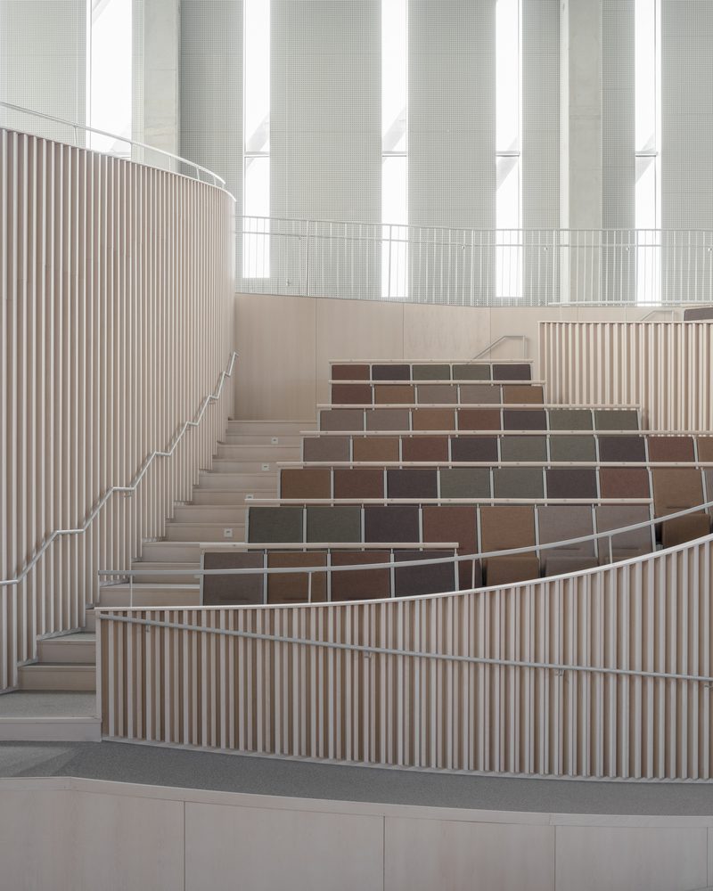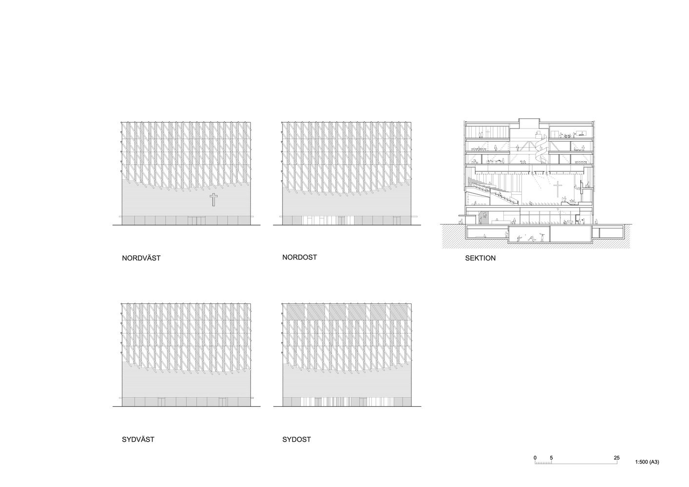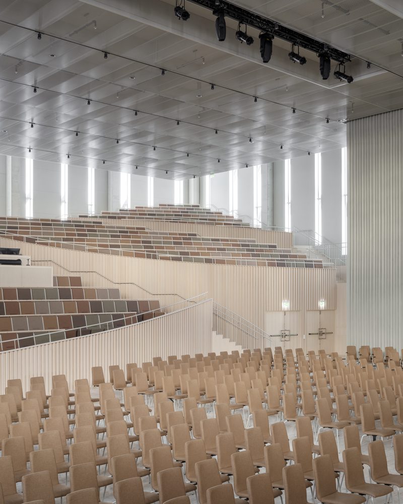 The extensive social agenda needs an extrovert architecture; the largest church hall of 1100 seats was allowed to dictate the building’s footprint, a huge sacral space, column-free 40×40 meters, wrapped by exterior facades all around. Open to the city and with daylight from all sides, the room feels half outdoor; a gesture as profane as it is sacral. Free-form terraces, the scale of the space, and its natural light make it equally landscape and architecture, alluding to past gatherings outdoors, before churches. The facades’ undulating border is given by the interior landscape, sawed wood below the rake, an abstract representation of a comb of wheat above.