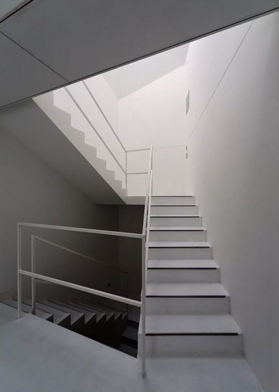 The architects chose to create a volume for natural light in an area so abundant with artificial light. Three ‘light funnels’ make up the roof, channeling light into the interior upper floor, which then filters through to below by way of slit-windows set into the floor. The interior is really something. Very clean lines, sharply executed details, the light from above- which exists for the most part as sourceless due to the depth of the stacks- plays off the smooth white concrete walls with a sense of… theatre almost.