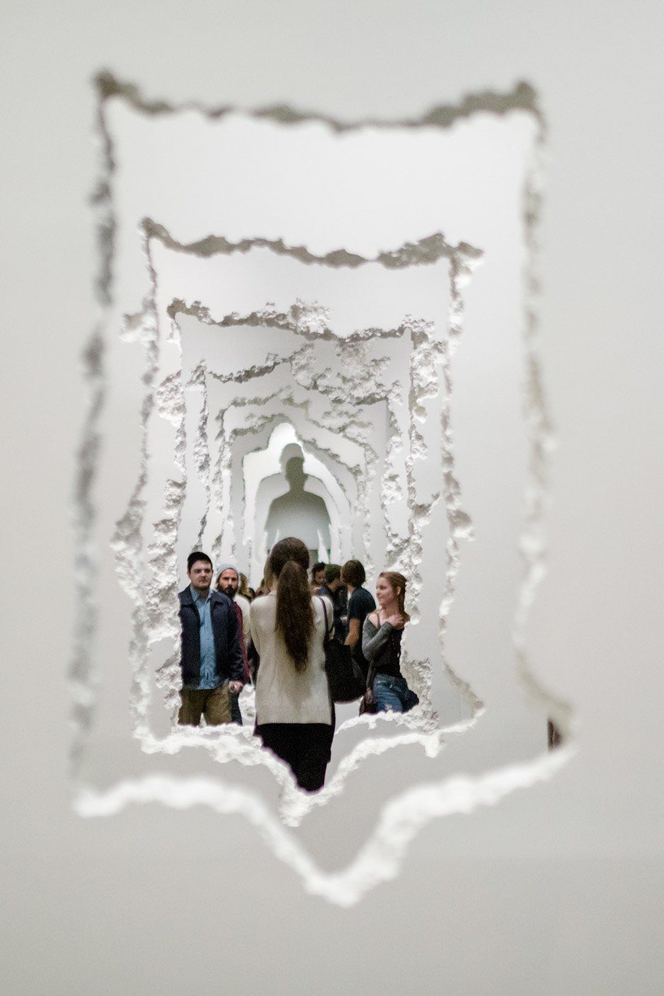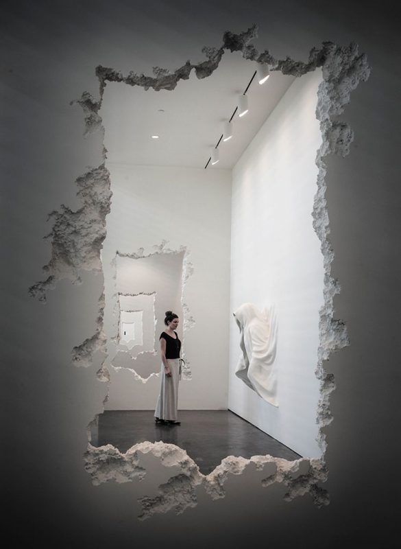 Our past is what links us to our present and to the future. In a studio behind an usual door a mind explored architecture linked to mankind’s place in history, leading to the creation of “The Future Was Then”. From 2001 to present, the New York based designer Daniel Arsham exhibits an unique perception of art through paintings, sculpture, architecture, film and performance. He is well known for his work in architecture or architecture inspired art, such as his fabric installations or alteration of space. This installation by Daniel in the SCAD Museum of Art for the Pamela Elaine Poetter Gallery is a large wall excavation. Daniel carved into repeated series of faux-concrete wall which in the end morph from abstract forms into a silhouette of a human figure. The visitors walk around its immediate surrounding with other selected sculptural works.
