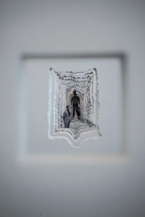 Arsham’s imagination has always presented a sense of playfulness, but at the same time invoked a deep thought. The perspective formed due to the gradation of carved walls indulges the visitor into the concept of evolution at an individual level. The faux walls displays the carved out past leading to the very beginning and connecting the timeline of various civilizations, also portraying man’s capacity to create and destroy natural materials. The repetitive perforation generates a feeling similar to the one of looking into a repetitive reflection in a mirror.