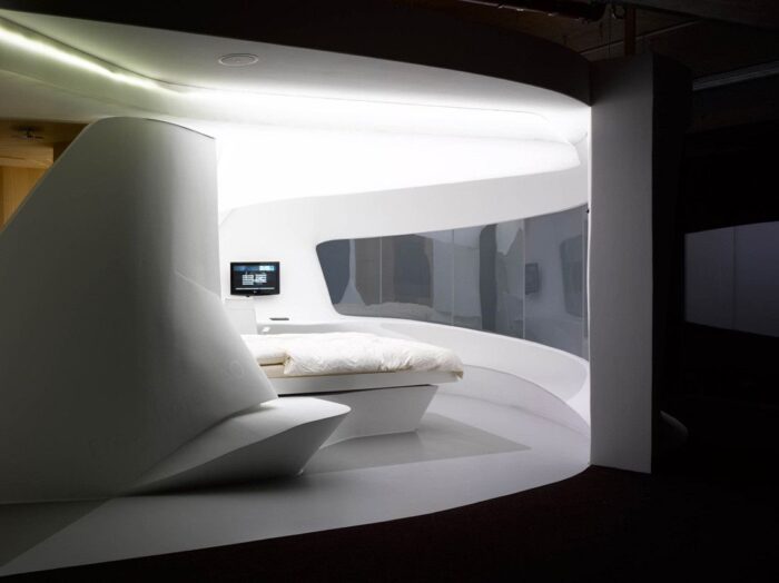 The main material used for the surfaces and carved furniture is plasterboard –which I hope they eliminate in the real future- with a translucent membrane stretching across the ceiling creating a soft lighting affect that can be changes by the guest to suit their mood.