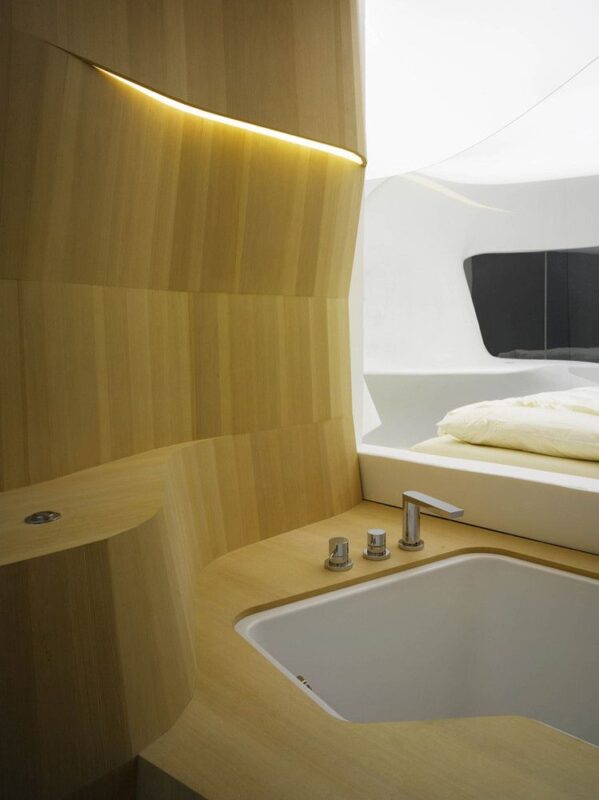 The room showcases the latest technologies wrapped in the interior space allowing for a personalizable and responsive space through the introduction of anti-jet-lag lights, an active comfort bed, a personal spa area, an intelligent mirror and a large media display window. The design is very interesting as it feels a bit like a claustrophobic cave with a lot of perks. The timber in the personal spa provides a breath of much needed warmth and softness.