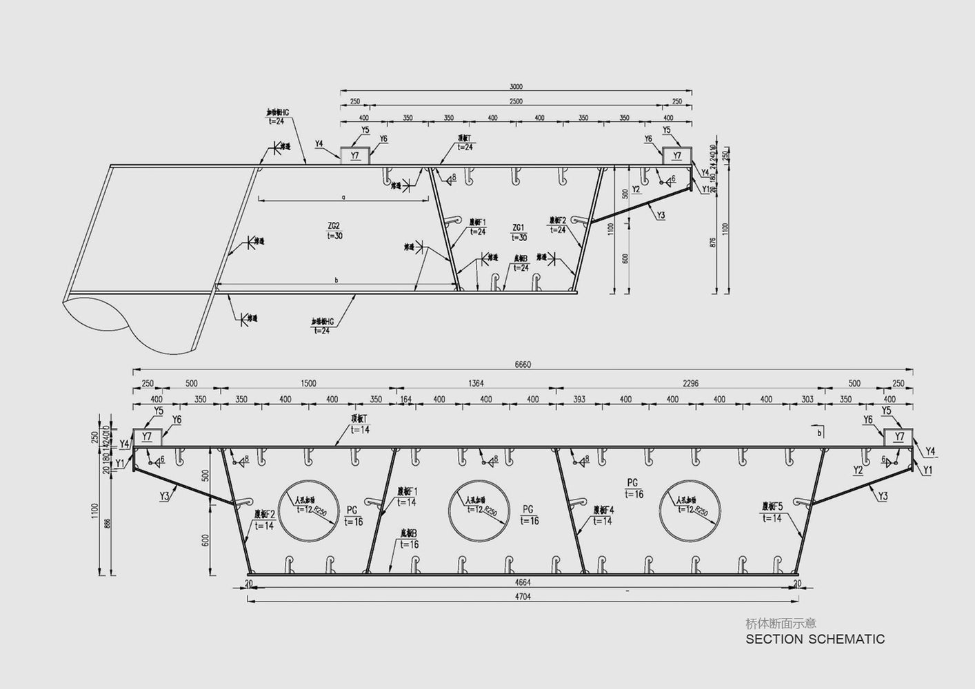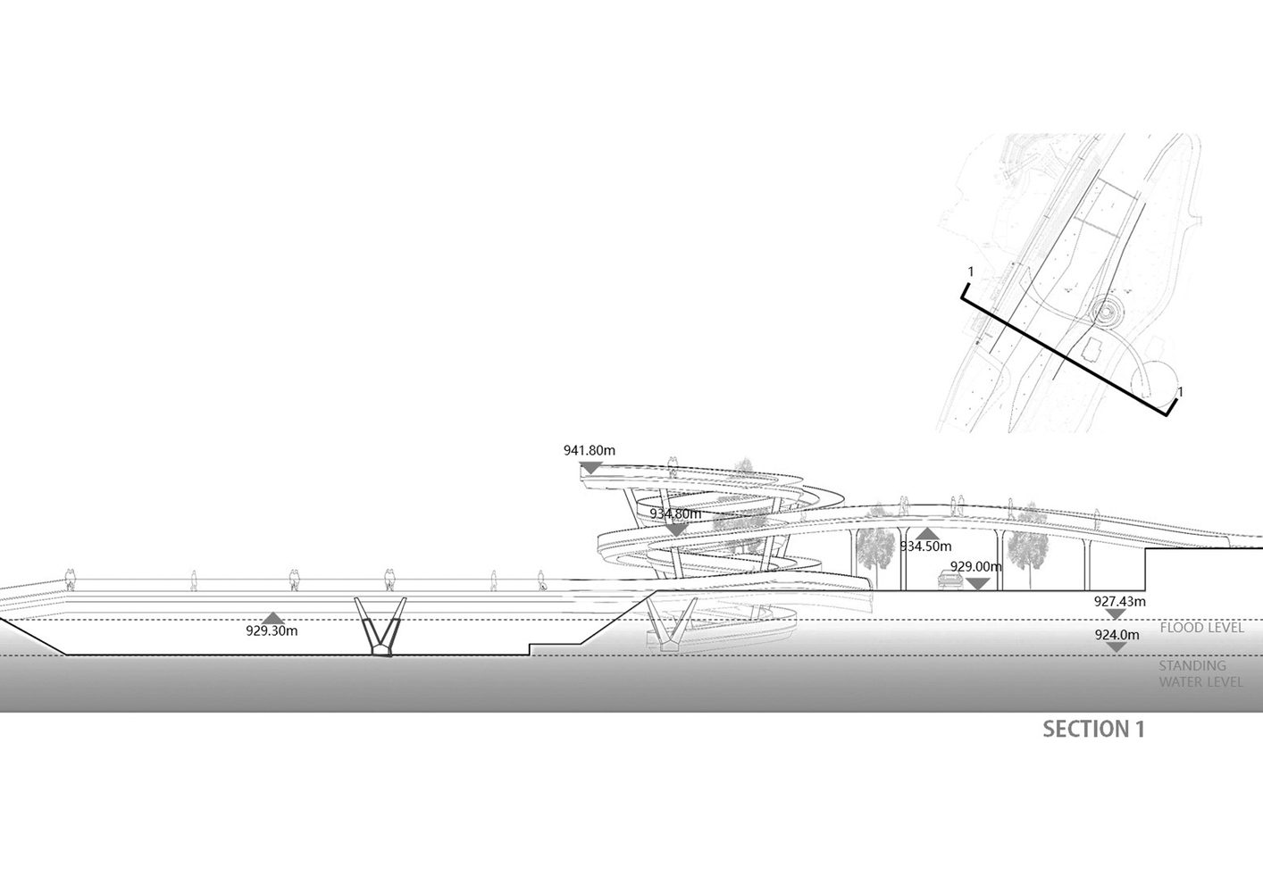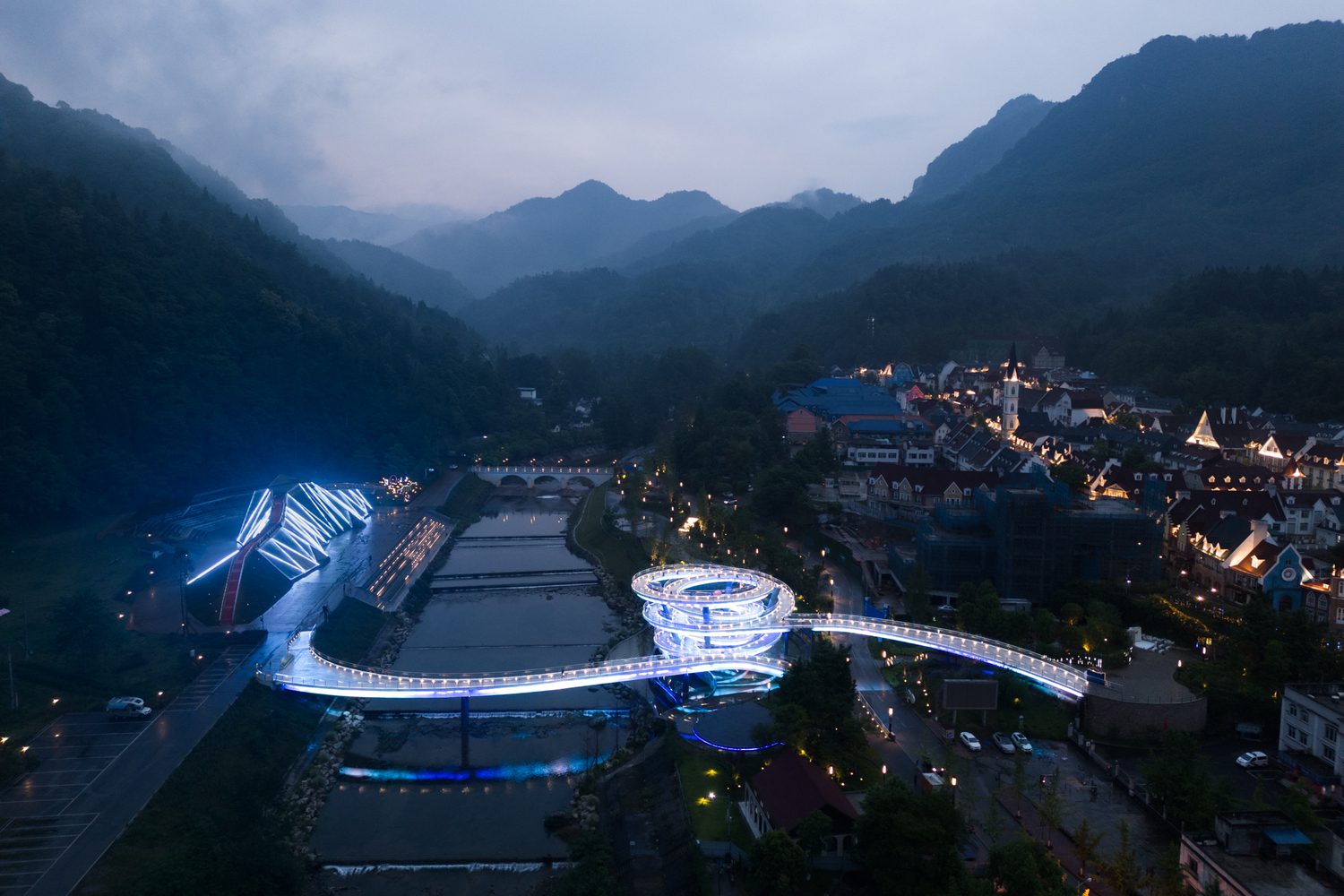 G Clef Bridge spans the Bailu River, connecting the French-style Bailu Music Town on the east bank with the modern, metallic Diamond Music Hall on the west bank. The bridge is located 550 meters downstream from the historic Sino-French Bridge site. The design employs fluid curves to establish a connection between the two banks and to harmonize the contrasting architectural styles. The main bridge deck extends from the “ridge path” of the Diamond Music Hall, winding across the river. It then utilizes a spiral ramp to rise over the riverside road, reaching the small open-air stage of the music town. The spiral ramp further extends upwards to form an aerial viewing platform, which also serves as a high stand for outdoor performances at the Diamond Music Hall, and downwards to integrate with the riverside landscape, forming a waterfront platform.