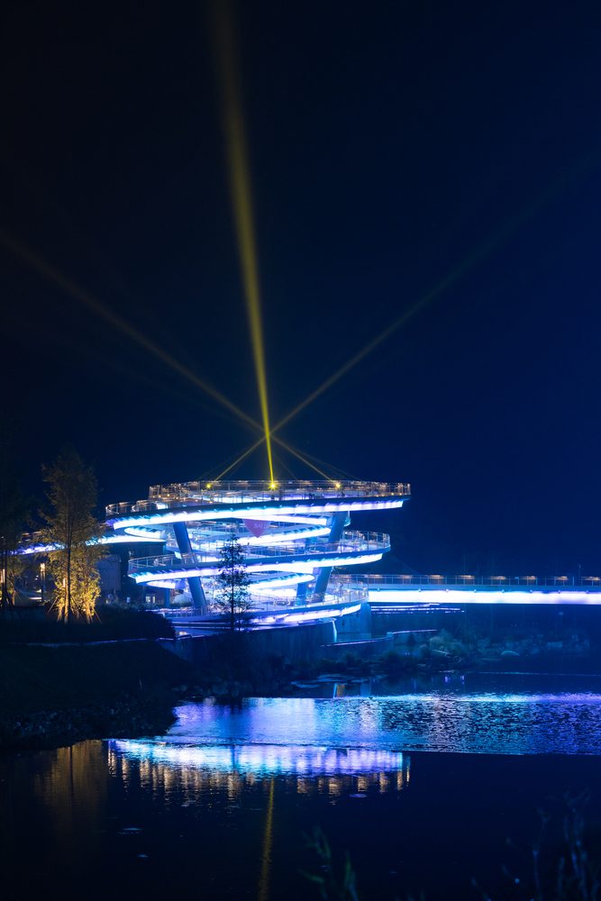 Inspired by the treble clef of the musical staff and the swirling of water, G Clef Bridge embodies the core elements of the music-themed tourist area, revolving around the “Melody of Water” theme to create a unique bridge design. The structure integrates two winding bridge decks and double spiral viewing platforms. The pedestrian pathways connect at multiple points, providing a smooth, continuous experience. The spiral ramp and waterfront platform offer multi-level, 360-degree panoramic views. Additional features include a floating stage for live performances, partial glass bridge decks inspired by the local historical “Broken Bridge,” and an integrated riverside waterfall landscape. The bridge provides a novel, stimulating, and immersive walking experience that strongly attracts visitors. The night lighting design further enhances the visual impact of the bridge, adding movement and rhythm, making it a focal point of the area’s nightscape.
