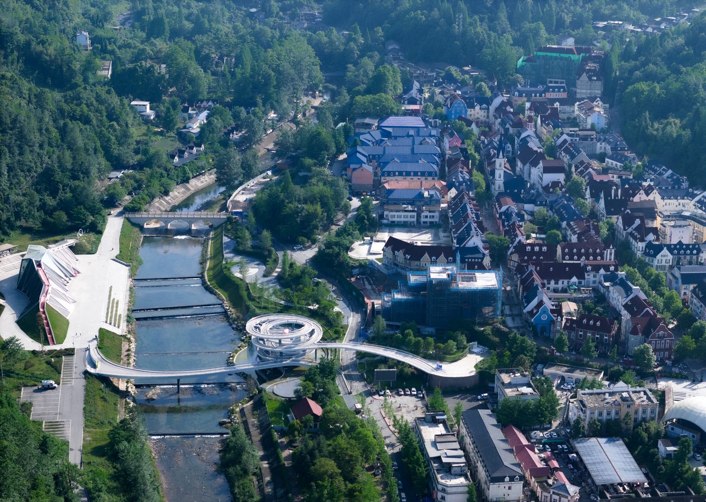 G Clef Bridge is located in the core area of the Bailu Music Tourist Area in Bailu Town, within the Longmen Mountains of Chengdu, Sichuan, China. The Bailu Music Tourist Area spans 2.9 square kilometers and is 60 kilometers from downtown Chengdu. It is a national 4A-level tourist attraction known for its rich historical and cultural resources. The area includes renowned sites such as the Annunciation Seminary, the Sino-French Friendship Bridge, the Old Street of Bailu Town, the “most impressive teaching building” at the 5.12 earthquake site, and the geological wonder of Flying Peak.