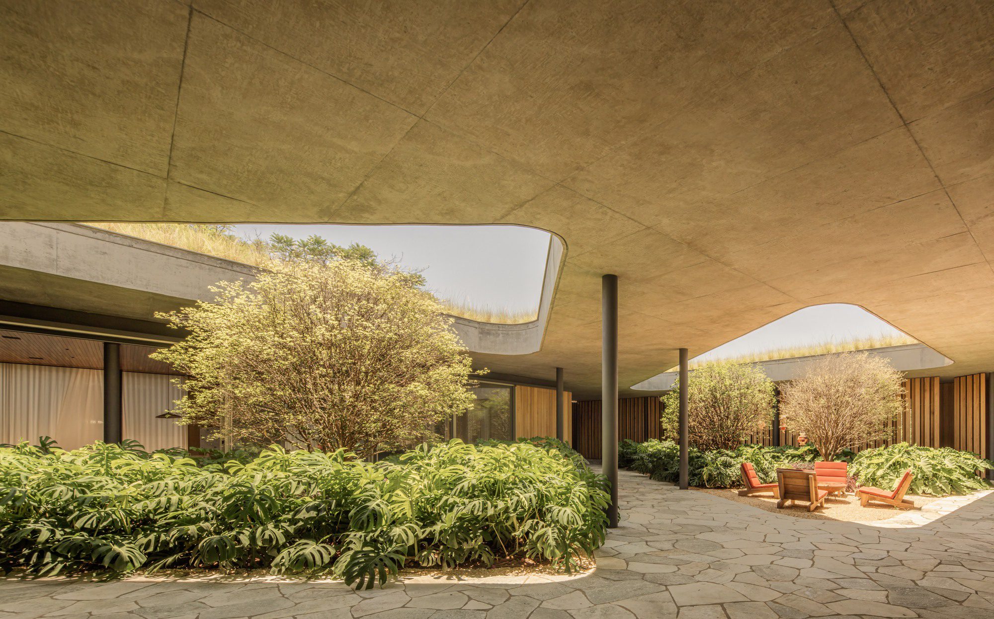 To support the large green roof, a mixed structure of concrete and steel was chosen. The presence of vegetation contributes to the creation of a more pleasant microclimate, reducing cooling costs and energy waste. Cross ventilation is facilitated by openings along the pavilions, and when the sliding panels are open, the internal and external spaces fully integrate. The abundance of natural light was an essential aspect of the project’s implementation, seeking balance between wide views of the landscape and thermal comfort. Taking advantage of this condition, the set of solar panels supplies the electrical system.