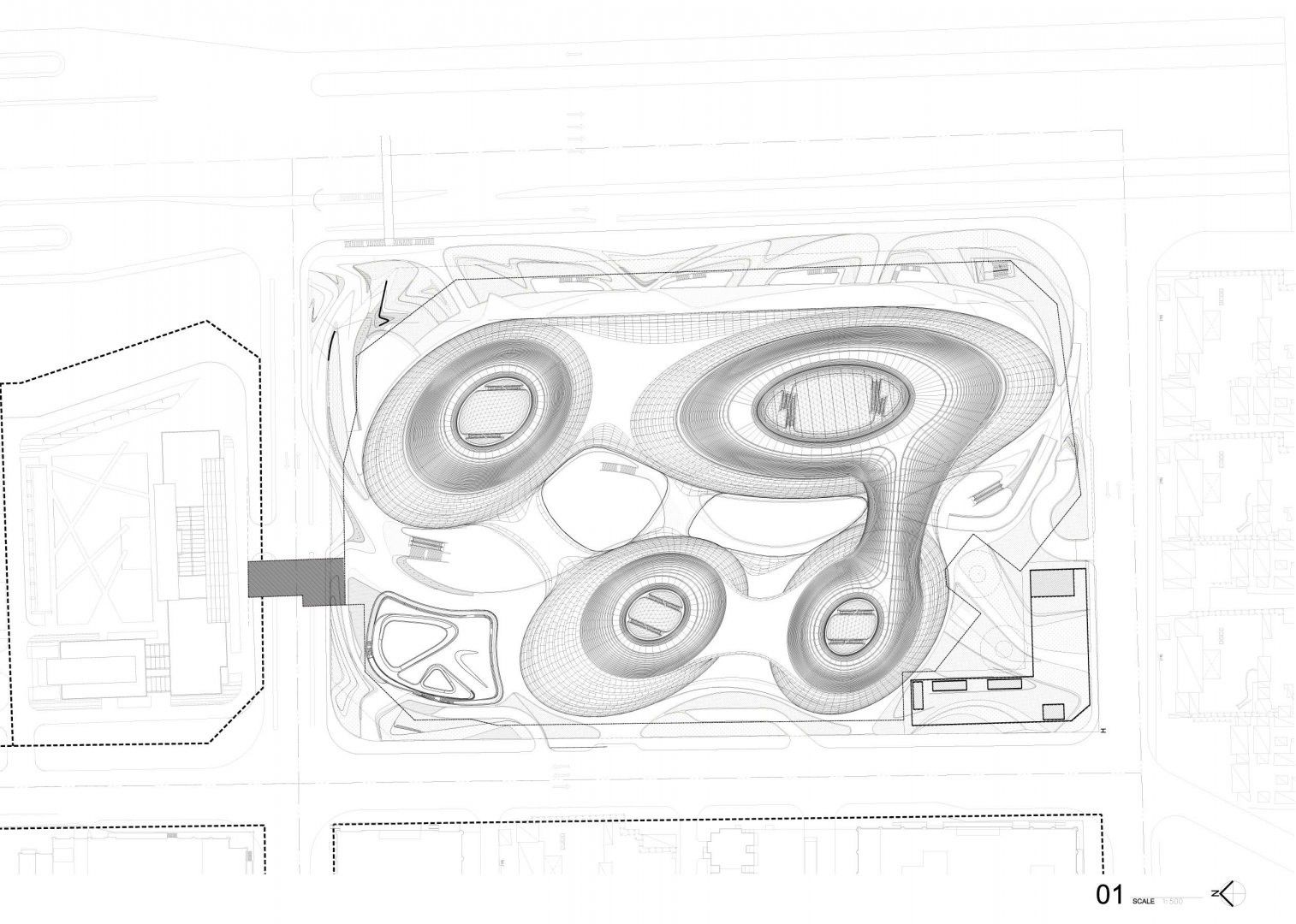 Galaxy SOHO is Zaha Hadid Architects’ re-interpretation of the traditional Chinese courtyard. Lacking corners, the volumes and spaces created by the coming together of five main volumes- continuous and flowing in their own rights- exude an energy and directionality without a definite vector. The lines encourage visitors’ eyes to wonder and move across the forms, never reaching a point where they are held without means of escape. The new office/ entertainment complex built by SOHO China Ltd. is composed of four towers containing a total of 15 above-grade floors (12 office; 3 retail).