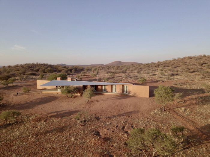 A farm gate set in a red earth wall introduces the visitor to the unique character of this hunting farm. From the entrance, a red dust road lingers through a Savannah grass veld scattered with thorn trees. Upon approach, the lodge slowly emerges out of the spectacular red earth, a solid mass with deep shadows and simple lines blending into the surroundings; a low slung linear structure offering shelter against the harsh Namibian environment.]