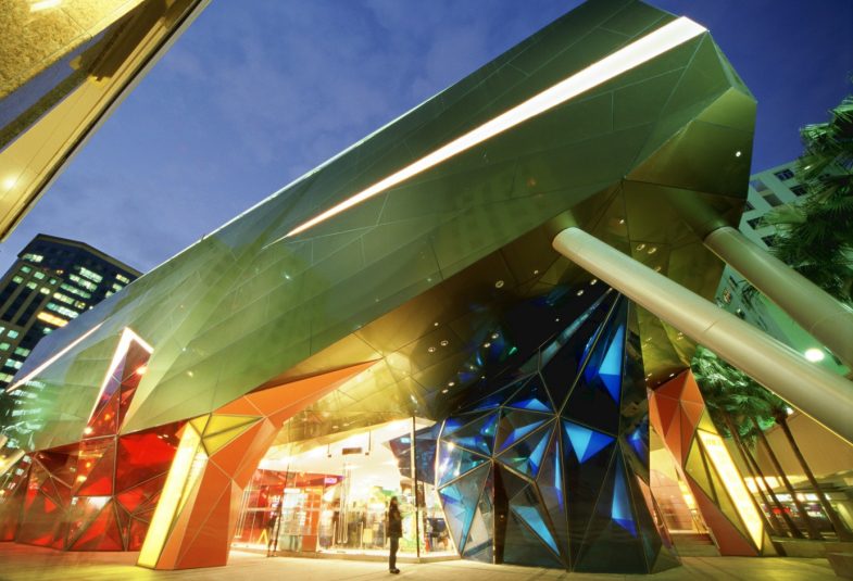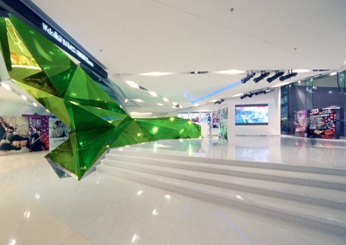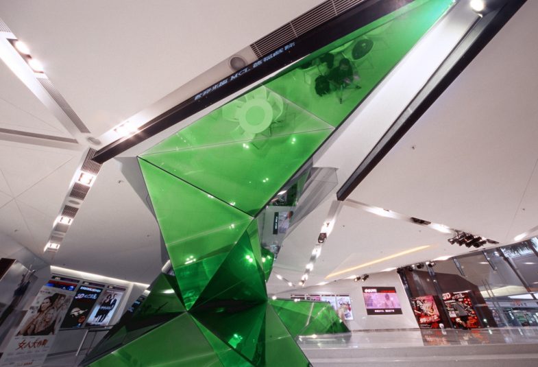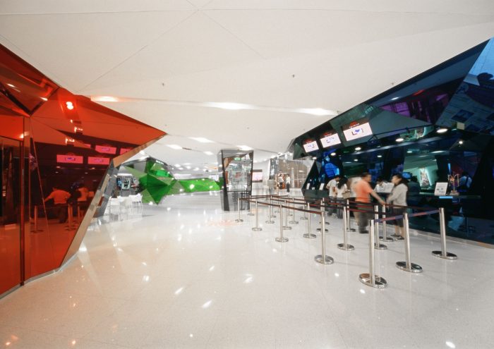 Like a GEM, the multi-faceted surface, can be displayed in different colour ambiences whilst viewing from different angles, together with the level of pleasure is elevated by the colourful sculptural pieces of ‘gem’, which serve important function as ticketing, concession and entrance to cinema. Their sculptural form resemble the cutting and polishing of gem, rich in details, through lighting, coloured triangular shaped laminated glasses, reflection and refraction simulate the lighting theory of gem, sapphire, emerald and ruby. The architects describe the project, stating that: