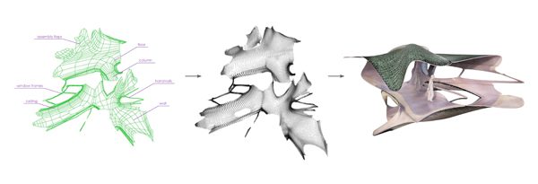 This is how the RES team simulate material behaviour at a high resolution. The outcome is therefore quite visible – the fiber patterning processed during the generative process represents the building form and its parameters. This is how even the structural analysis of a building can be generated at a minimized, almost no physical construction technique provided.