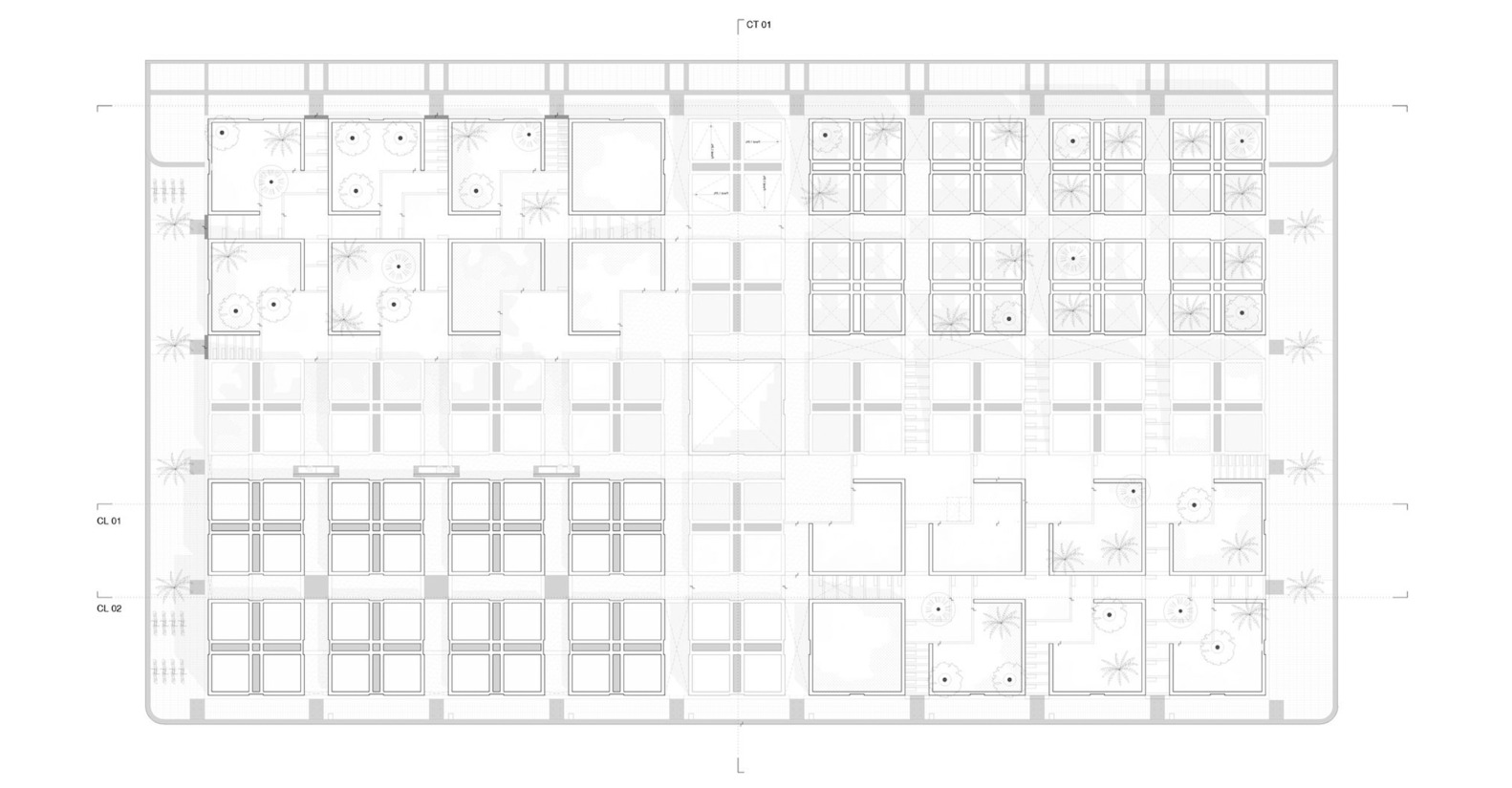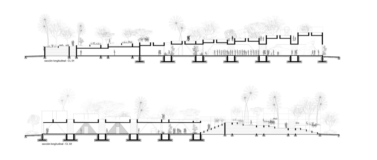 The urban space doesn’t just stop at the ground level; it extends to the roofs of the building. As you ascend from street level, the habitable volumes increase in height, leading to elevated paths resembling terraces adorned with suspended gardens. These upper paths offer captivating experiences and breathtaking views of different sizes, connecting the cultural space with the urban environment.