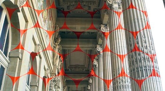 Geometric Projections , Swiss artist Felice Varini is know for his large scale geometric form projections. He uses stencils and projectors to create patterns that only appear proportional when seen from a specific viewpoint.