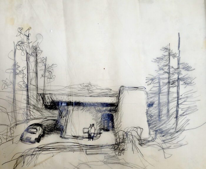 Frank Gehry, Greber Studio Sketch, 1967, unbuilt; Beverly Glen, California; Frank Gehry Papers at the Getty Research Institute, © Frank O. Gehry